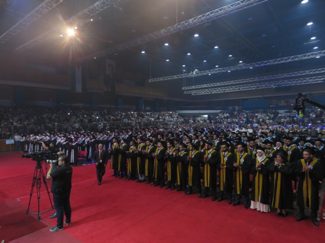 وفي ختام الحفل قام راعي الحفل والى جانبه رئيس الجامعة بتسليم الشهادات للخريجين والخريجات وسط احتفال بهيج زينته تقنيات الارينا الحديثة من إضاءة وتصوير وموسيقى .