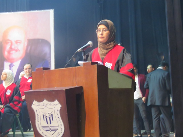 تلا ذلك قصيدة للطالب يعقوب مهنا تغنى بها بالجامعة وتميزها وانجازاتها ثم كلمة الخريجين والخريجات باللغة الانجليزية القاها الطالب مصعب خليفات شكر فيها الجامعة واسرتها واشاد بمسيرتها وهنأ زملاءه وزميلاته الخريجون والخريجات .