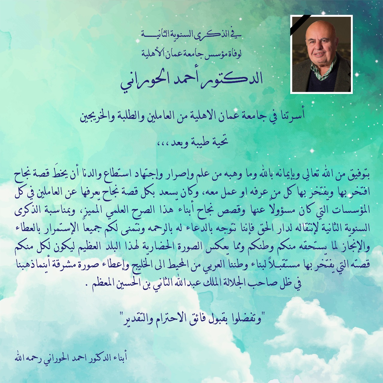 في الذكرى السنـوية الثانيــــــــة لوفاة مؤسس جامعة عمان الأهلية الدكتور أحمد الحوراني تقدم أبناؤه وبناته برسالة الى اسرة الجامعة هذا نصها :