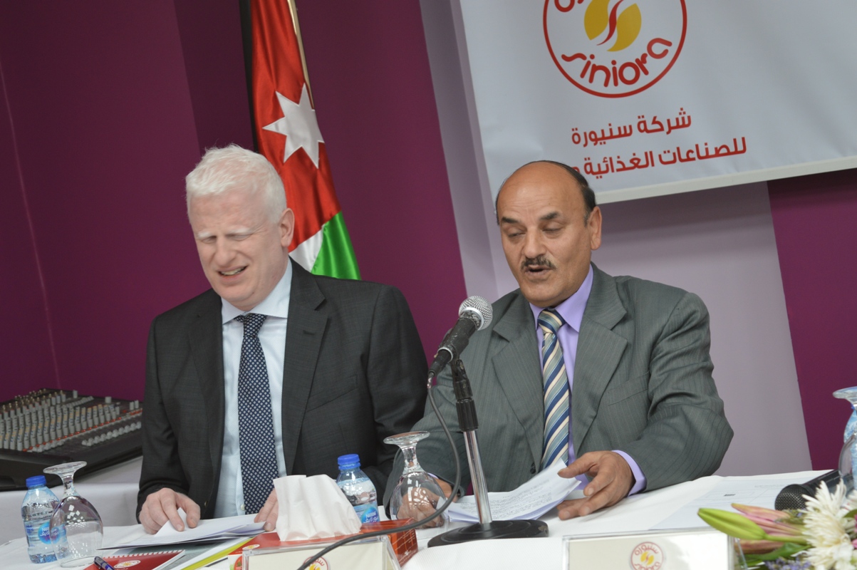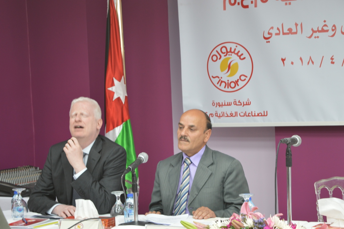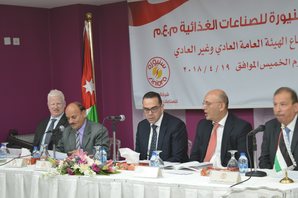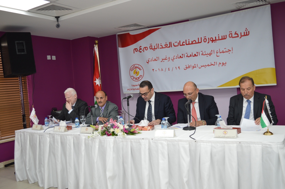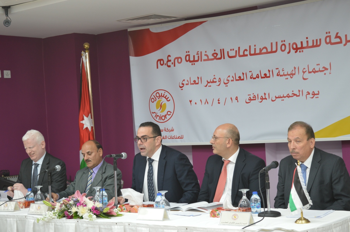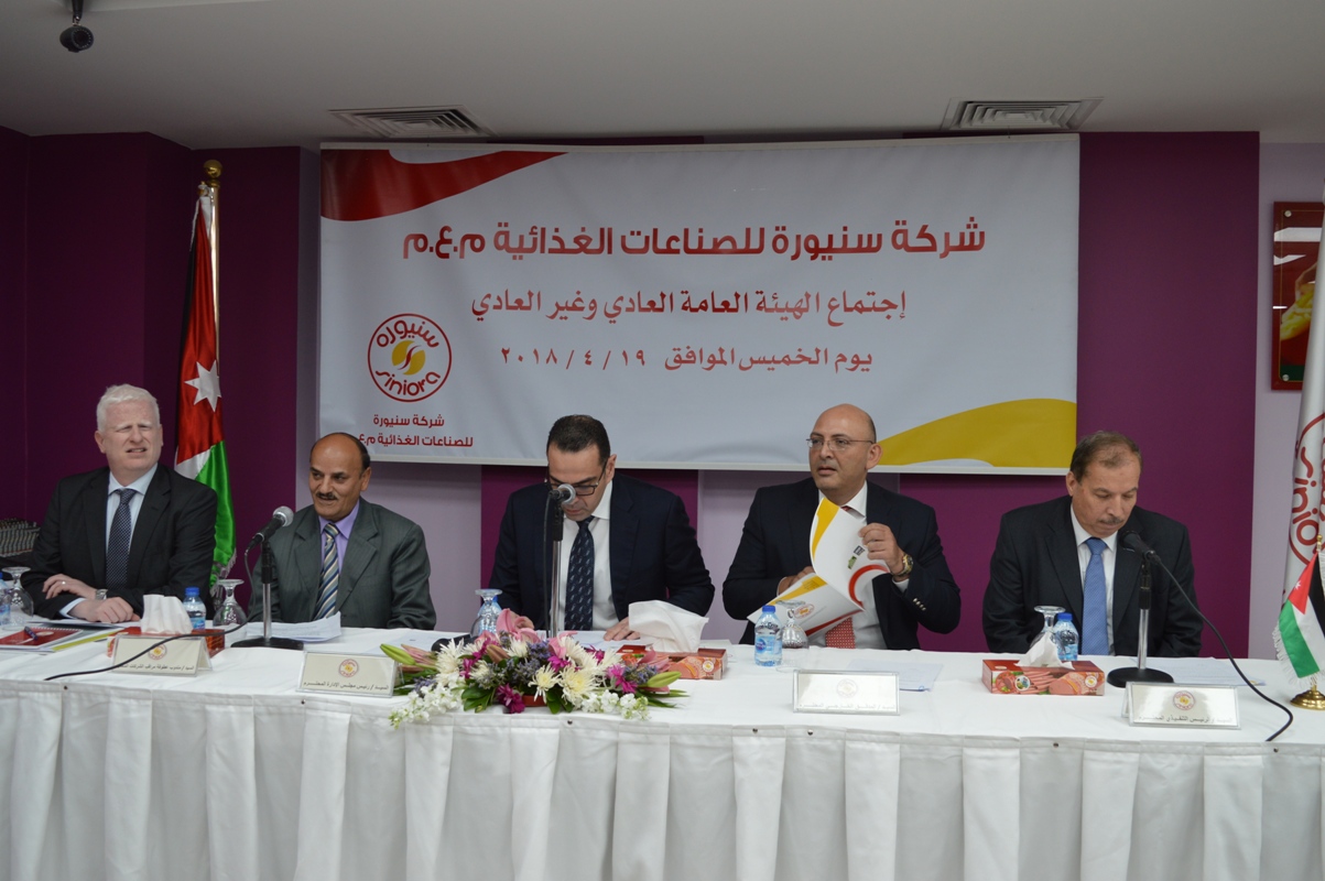 عقدت شركة سنيورة للصناعات الغذائية يوم الخميس الموافق 19/04/2018 اجتماع الهيئة العامة العادي وغير العادي في مدينة عمان بالأردن برئاسة السيد طارق عمر العقاد، رئيس مجلس الإدارة. ووافقت الهيئة العامة على توزيع أرباح عن السنة المالية المنتهية في31/12/2017 بنسبة 23.63% من رأس المال، وذلك بواقع 10% كأرباح نقدية أي ما يعادل 2.2 مليون دينار أردني (3.1 مليون دولار أمريكي) و13.63% على شكل أسهم مجانية عددها 3 مليون سهم، وبذلك سيرتفع رأس المال المدفوع للشركة ليصبح 25 مليون دينار أردني (35.3 مليون دولار أمريكي(.