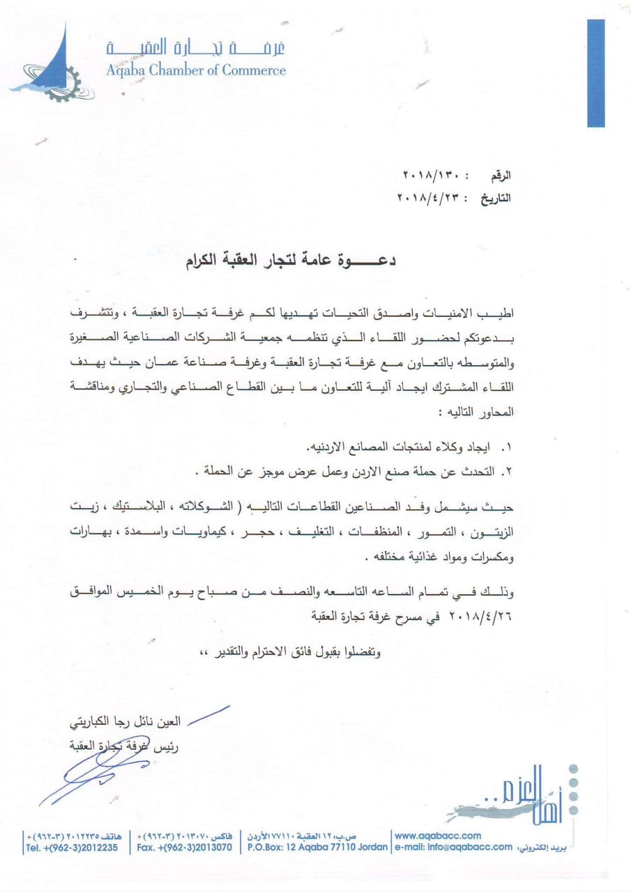 تتشرف غرفة تجارة العقبة بدعوة تجار العقبه الى اللقاء الذي تنظمه جمعية الشركات الصناعية الصغيرة والمتوسطة وبالتعاون مع غرفة تجارة العقبه وغرفة صناعة عمان حيث يهدف اللقاء المشترك إيجاد آلية للتعاون ما بين القطاع الصناعي والقطاع التجاري ومناقشة المحاور التالية