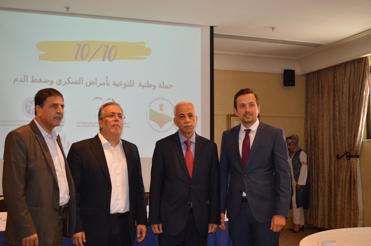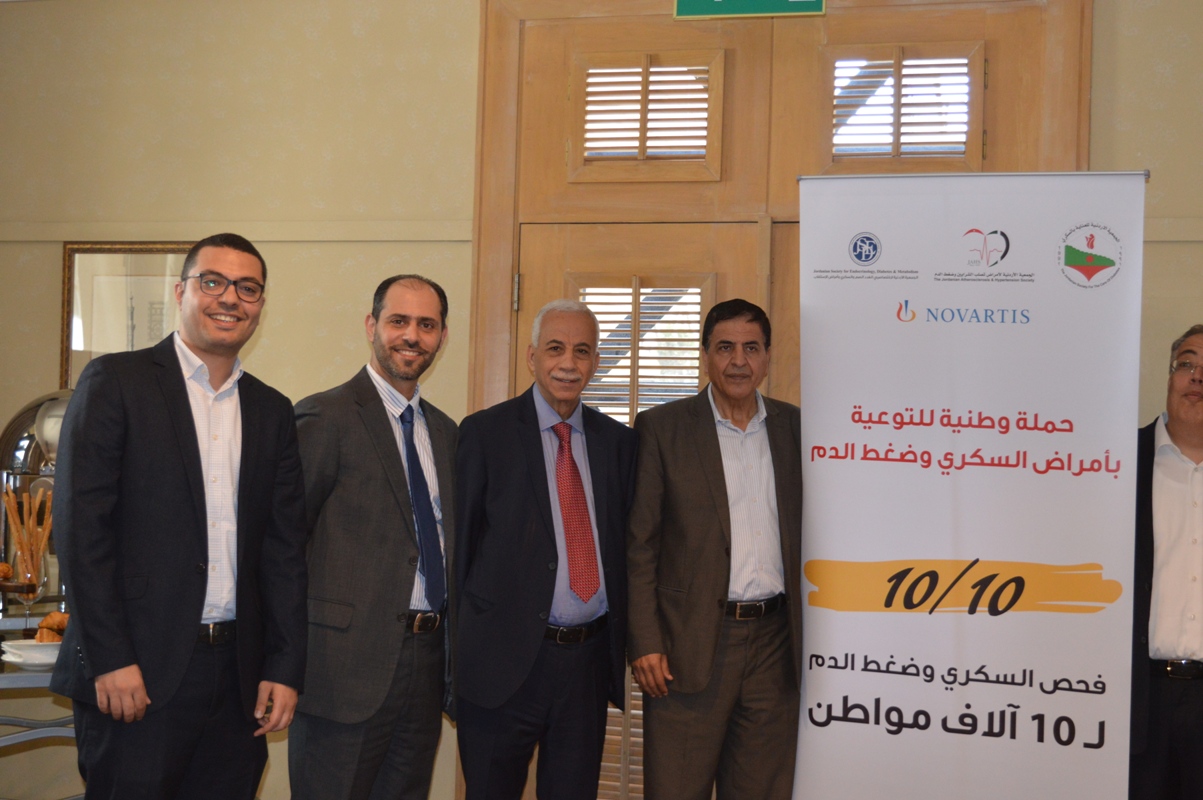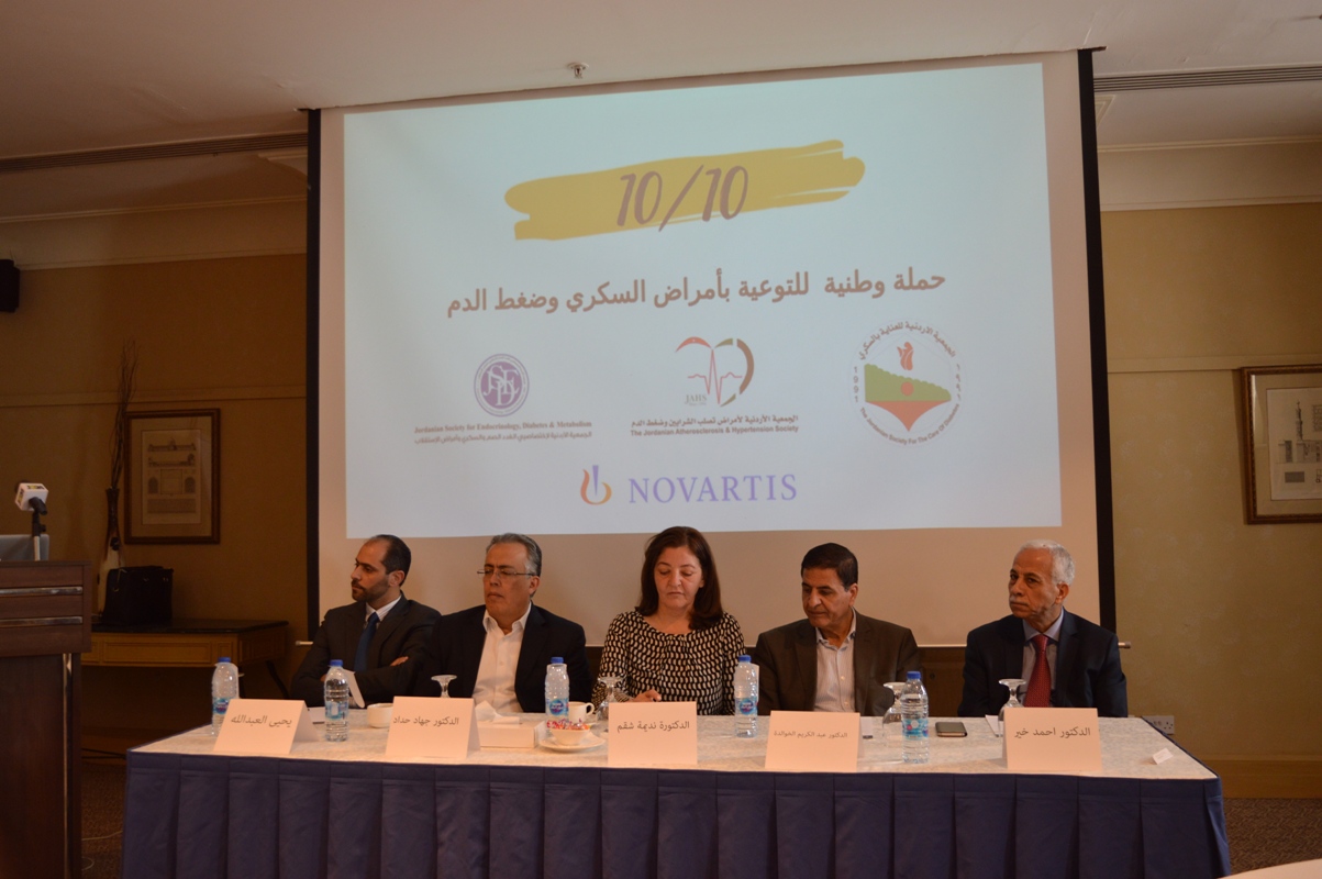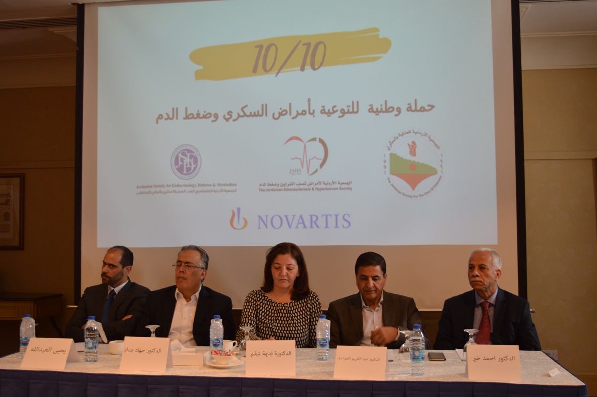 عمان 9 ايار 2018 – أطلقت الجمعية الأردنية للعناية بالسكري، والجمعية الأردنية لاختصاصيي الغدد الصم والسكري وأمراض الاستقلاب، والجمعية الأردنية لأمراض تصلب الشرايين وضغط الدم أمس حملة وطنية للتوعية بمرض السكري والضغط بعنوان "١٠/١٠" بمناسبة اليوم العالمي للضغط وحلول شهر رمضان المبارك، وتنطلق الحملة بدعم من شركة نوفارتس، وذلك في مؤتمر صحفي حضره عدد من الصحفيين والأطباء والمتخصصين المهتمين بالقطاع الصحي في الأردن.