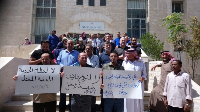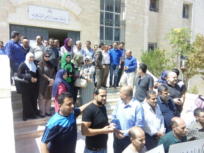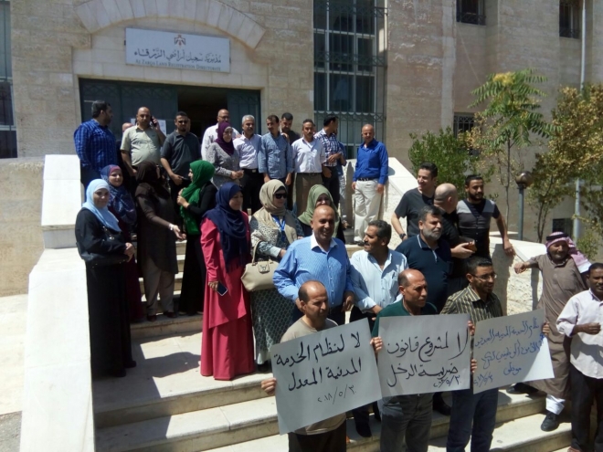 نفذ الموظفون والعاملون في مديرية اراضي الزرقاء اضرابا وتوقف عن العمل أمام مبنى المديرية تنديدا بقانون ضريبة الدخل الجديد والذي من شأنه المس بجيوب ومعيشة المواطنين.