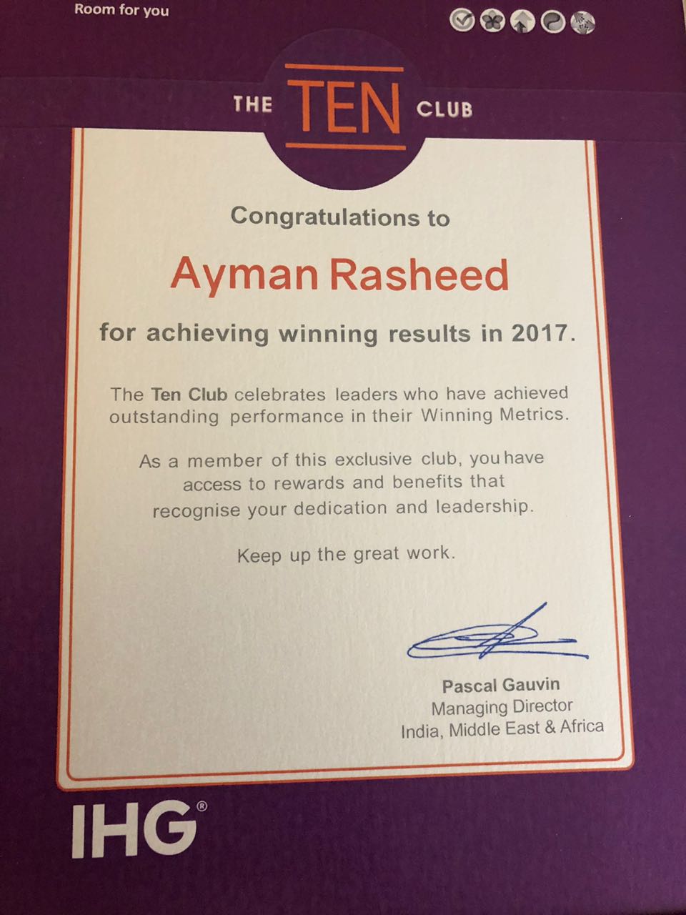 وقد قام السيد كينيث مکفیرسون الرئيس التنفيذي لأوروبا والشرق الأوسط وآسيا وافريقيا والسيد باسكال جوفان مسؤول التشغيل الرئيسي في الهند والشرق الأوسط وأفريقيا، بتسليم مدير عام فندق "هوليداي إن عمان" السيد أيمن رشید، جائزة " تين كلوب" لأداء الفندق المتميز تحت قيادته خلال العام الماضي.