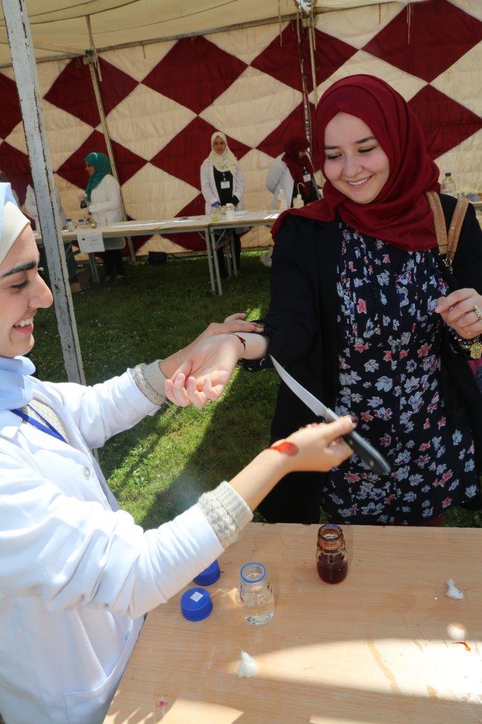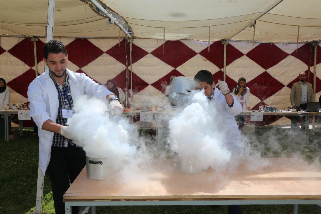 وقدم طلبة قسم الكيمياء عددًا من تجارب الكيميائية الشيقة التي تحاكي أسرار المادة وخصائصها كما قدم الطلبة بإشراف الدكتور عبد المنعم الطويق تجارب بعنوان "سحر الكيمياء" في الهواء الطلق وذلك على المسطح الأخضر.