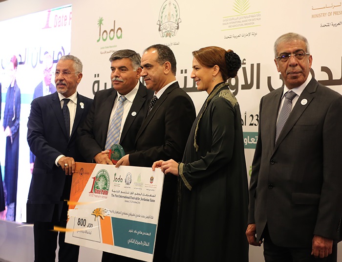 برعاية جلالة الملك عبد الله الثاني ابن الحسين "حفظه الله" ملك المملكة الأردنية الهاشمية شهد معالي المهندس إبراهيم الشحاحدة وزير الزراعة مندوب راعي المهرجان، وبحضور معالي مريم بنت محمد المهيري وزيرة دولة مسؤولة ملف الأمن الغذائي المستقبلي بالإمارات ممثلاً لسمو الشيخ منصور بن زايد آل نهيان نائب رئيس مجلس الوزراء وزير شؤون الرئاسة بدولة الإمارات العربية المتحدة، صباح الأحد 21 تشرين الأول / أكتوبر 2018 افتتاح المهرجان الدولي الأول للتمور الأردنية الذي تنظمه جائزة خليفة الدولية لنخيل التمر والابتكار الزراعي ووزارة الزراعة وجمعية التمور الأردنية بالتعاون مع عدد من الشركاء الاستراتيجيون منظمة الأغذية والزراعة (FAO) والمركز الدولي للبحوث الزراعية في المناطق الجافة (ICARDA)، والمنظمة العربية للتنمية الزراعية (AOAD)، والمركز الدولي للزراعة الملحية (ICBA)، والشبكة الدولية لنخيل التمر (DPGN)، والمركز الوطني للبحوث الزراعية بالأردن (NARC) وجمعية أصدقاء النخلة بالإمارات (DFS)، كما حضر الحفل سعادة مطر سيف الشامسي سفير دولة الامارات العربية المتحدة بعمّان، وسعادة الدكتور عبد الوهاب زايد أمين عام جائزة خليفة الدولية لنخيل التمر والابتكار الزراعي وسعادة الدكتور هلال حميد ساعد الكعبي عضو مجلس أمناء الجائزة والمهندس أنور حداد مدير جمعية التمور الأردنية وعدد من أصحاب السعادة السفراء ممثلي السلك الدبلوماسي العربي والدولي وممثلي المنظمات الدولية في المملكة الأردنية الهاشمية، وبمشاركة عدد كبير من الخبراء والمهتمين بقطاع زراعة النخيل وإنتاج التمور محلياً وعالمياً.