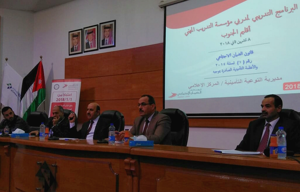 ورحّب مدير مديرية التدريب المهني في إقليم الجنوب المهندس غالب عدينات بالمشاركين وأشار إلى أهمية عقد مثل هذه البرامج التدريبية مبيناً أن الاتفاقية المبرمة بين المؤسسة العامة للضمان الاجتماعي ومؤسسة التدريب المهني تم توقيعها في عام (2014) وتم منذ ذلك التاريخ عقد برنامج تدريبي سنوي لمدربي مؤسسة التدريب المهني في كل من إقليم الشمال والوسط والجنوب، بالإضافة إلى طباعة كتيب تعريفي حول قانون الضمان الاجتماعي وتوزيعه على طلبة مؤسسة التدريب المهني كل عام.