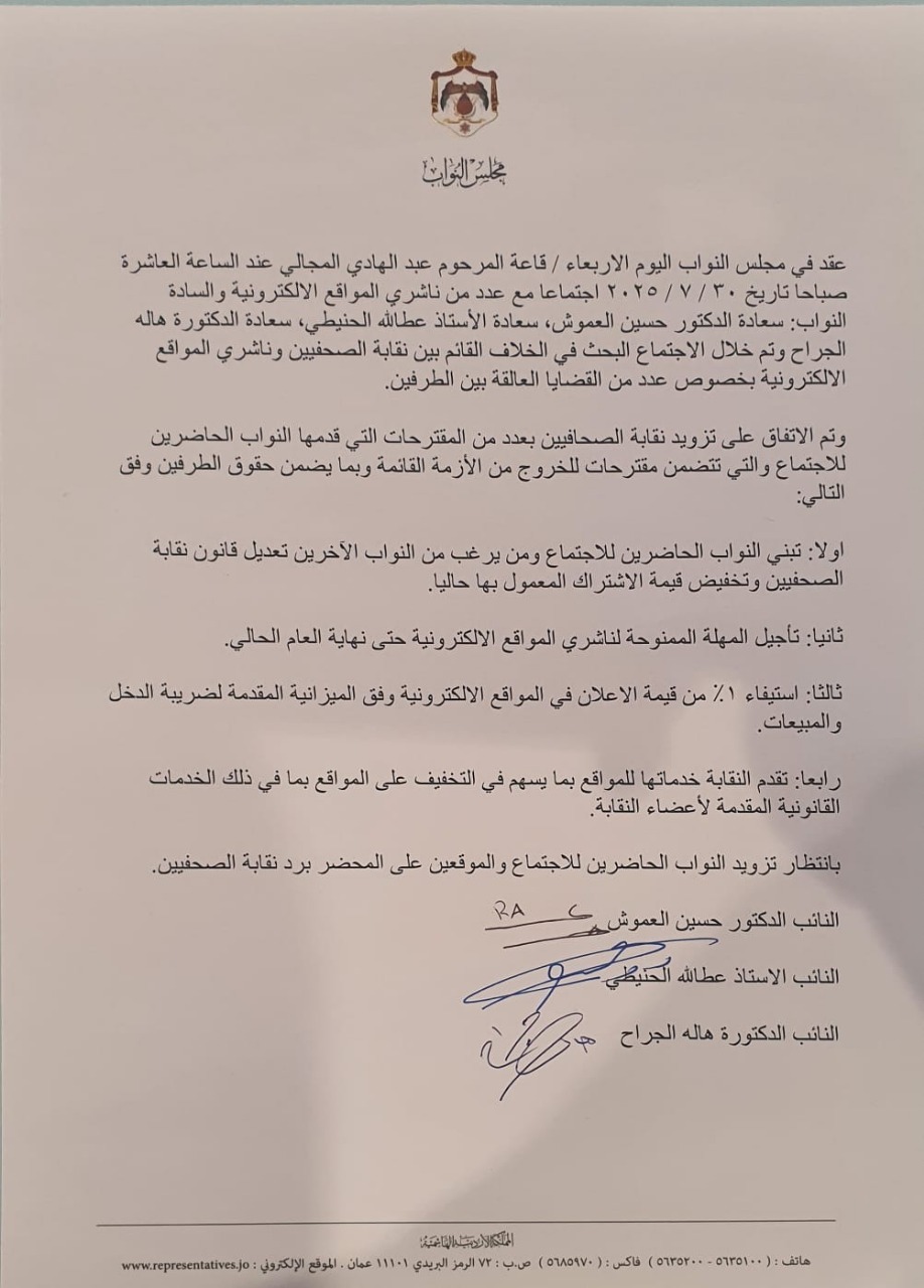 وأكد النواب أنهم بانتظار رد رسمي من نقابة الصحفيين الأردنيين على المحضر الموقع والمقترحات المطروحة خلال الاجتماع، تمهيداً للوصول إلى تسوية تضمن الحفاظ على مهنة الصحافة وحرية الإعلام من جهة، وحقوق النقابة وتنظيم المهنة من جهة أخرى.