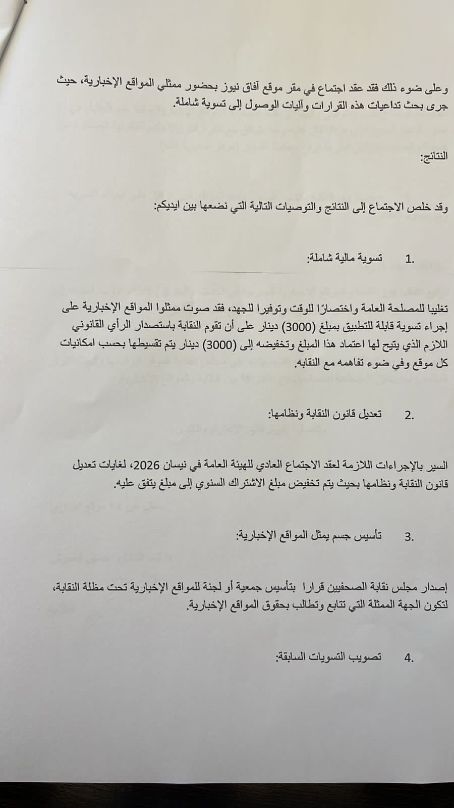 المواقع الإخبارية تسحب فتيل الأزمة و توجه مذكرة لنقابة الصحفيين الأردنيين والأخيرة تحيلها للدائرة القانونية لدراستها – وثيقة