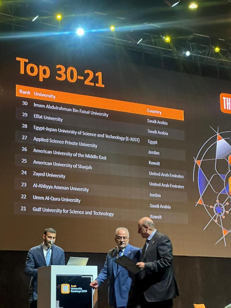 أعلنت مساء امس مع اختتام فعاليات اليوم الثاني لقمة تصنيف التايمز العربي 2025 نتائج تصنيف التايمز العربي 2025 ( من 21- 30) وذلك على هامش أعمال قمة التايمز للجامعات العربية التي استضافتها جامعة عمّان الأهليّة بالشراكة مع الجامعة الأردنية، والتي تُعقد لأول مرة في الأردن بمشاركة واسعة من ممثلي الجامعات العربية وخبراء التصنيفات العالمية.