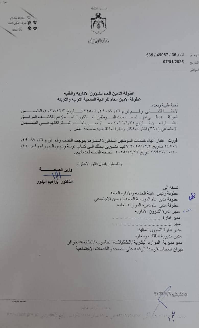الصبيحي : وزير الصحة إلغاء قرار سابق بإنهاء خدمات (15) موظفاً وإحالتهم إلى التقاعد المبكر
