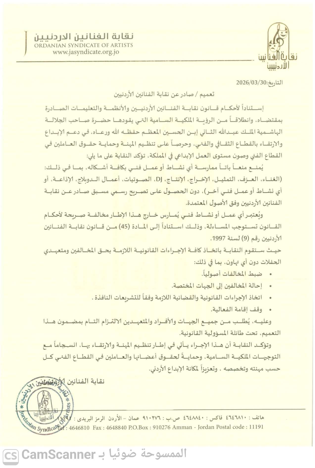 إستناداً لأحكام قانون نقابة الفنانين الأردنيين والأنظمة والتعليمات الصادرة بمقتضاه، وانطلاقاً من الرؤية الملكية السامية التي يقودها حضرة صاحب الجلالة الهاشمية الملك عبدالله الثاني إبن الحسين المعظم حفظه الله ورعاه، في دعم الإبداع والارتقاء بالقطاع الثقافي والفني، وحرصاً على تنظيم المهنة وحماية حقوق العاملين في القطاع الفني وصون مستوى العمل الإبداعي في المملكة، تؤكد النقابة على ما يلي: