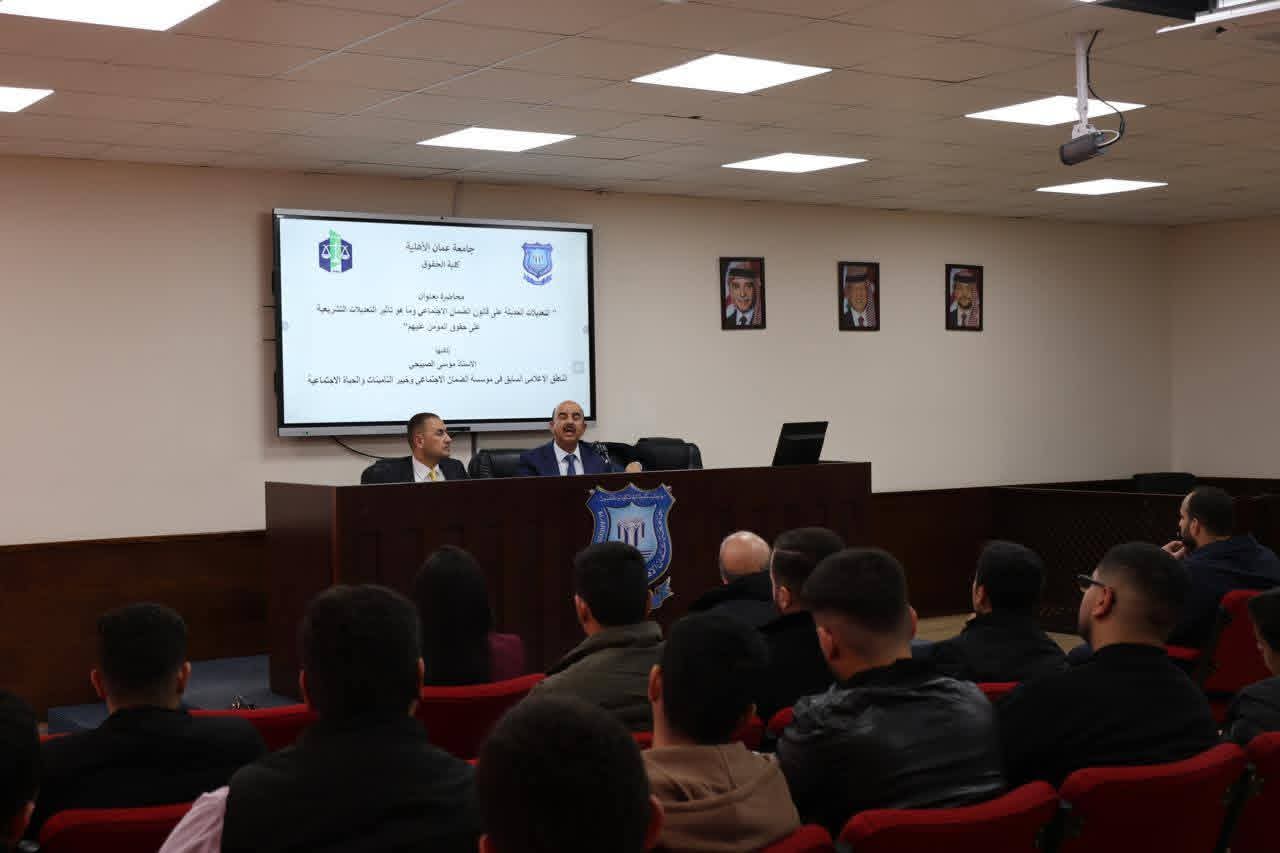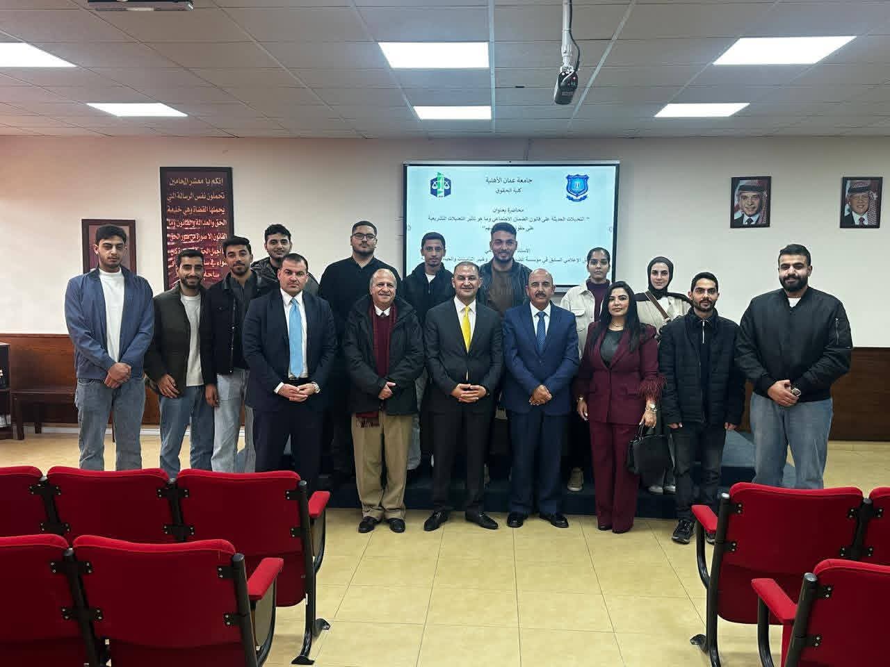 وأضاف في محاضرة نظّمتها كلية الحقوق بجامعة عمان الأهلية وادارها د. شادي الطراونة بحضور د. خالد الحريرات مساعد عميد الكلية، و د. نور الدباس مساعد عميد شؤون الطلبة، أن مؤسسة الضمان الاجتماعي والحكومة ملزمتان بموجب المادة ( 18 / ج ) من قانون الضمان بضرورة اتخاذ الإجراءات اللازمة للحؤول دون تعادل النفقات مع الإيرادات التأمينية من خلال تصويب السياسات والتشريعات بما يضمن الحفاظ على ديمومة النظام التأميني للمؤسسة وتعزيز مركزها المالي. مضيفاً بأن الوضع المالي لمؤسسة الضمان ليس سيئاً، لكنه مريح بحذر شديد، وأن ضمان استدامة أوضاعها المالية مستقبلاً، مرهون بما سيتم اتخاذه من إصلاحات جوهرية تشمل حزمة السياسات والعمليات اللازمة لتصويب الوضع المالي للنظام التأميني وتعزيز مستويات الحماية والعدالة الاجتماعية للضمان، وليس فقط تعديل القانون.