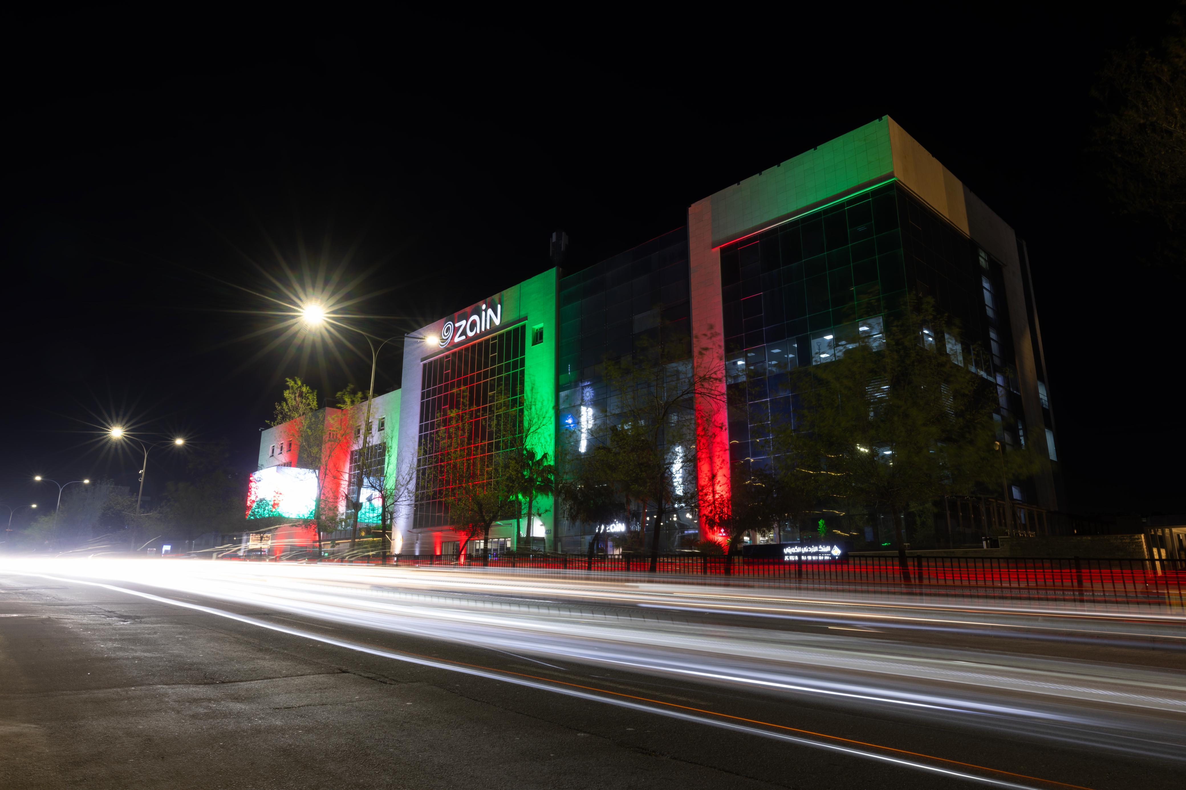 زين تبدأ احتفالاتها بيوم العلم بإضاءة مبانيها بألوان العلم