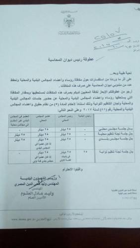 طالب امين عام وزارة البلديات وليد العتوم من رئيس ديوان المحاسبة بالإيعاز لمندوبي الديوان في البلديات بصرف مكافآت رؤساء واعضاء المجالس البلدية والمحلية لمستحقيها عن حضور الجلسات المحلية واللوائية استنادا لأحكام المادة 5 من نظام حقوق واعضاء المجالس البلدية والمحلية رقم 81 لسنة 2017.