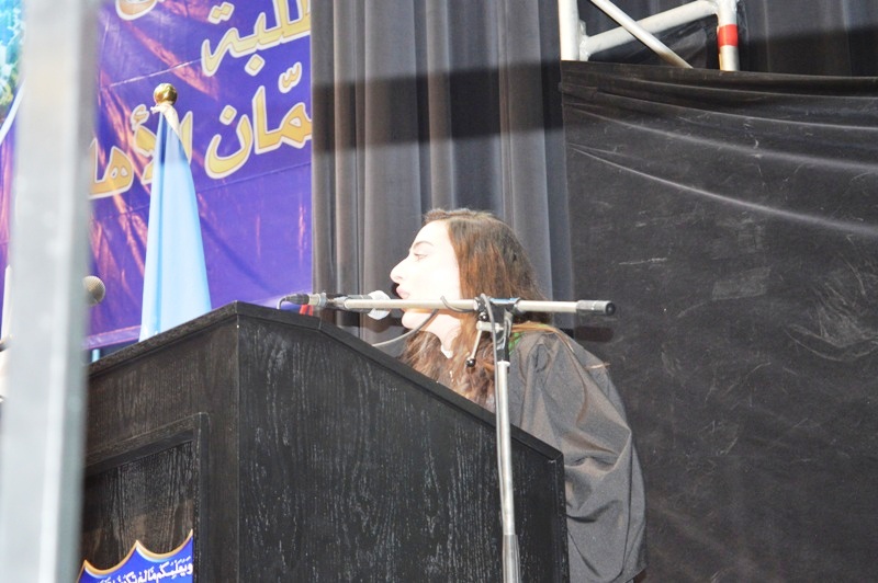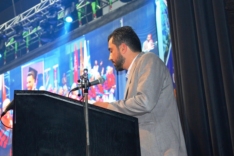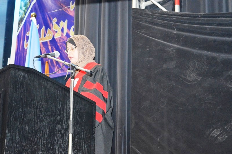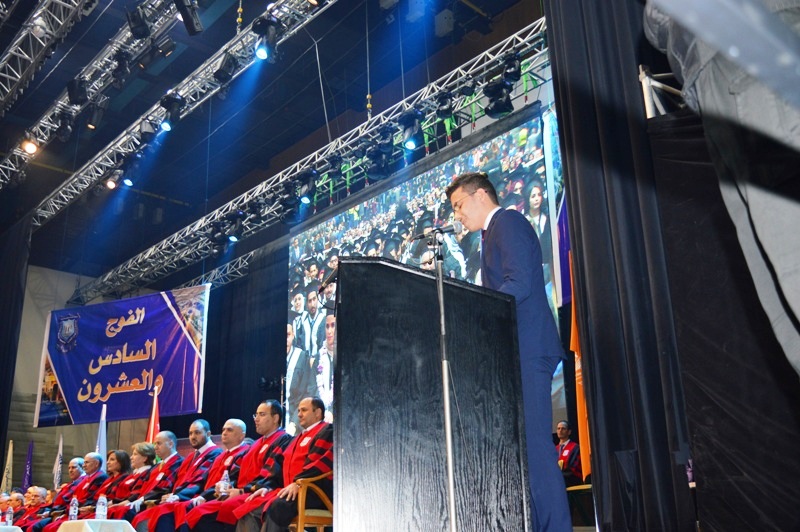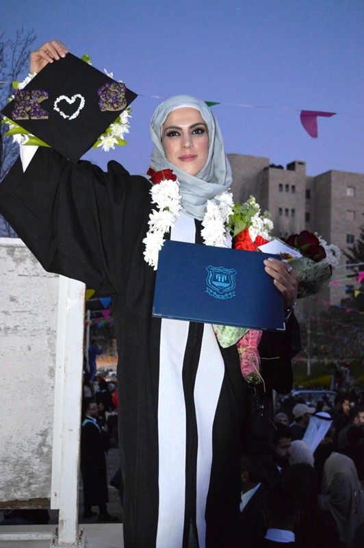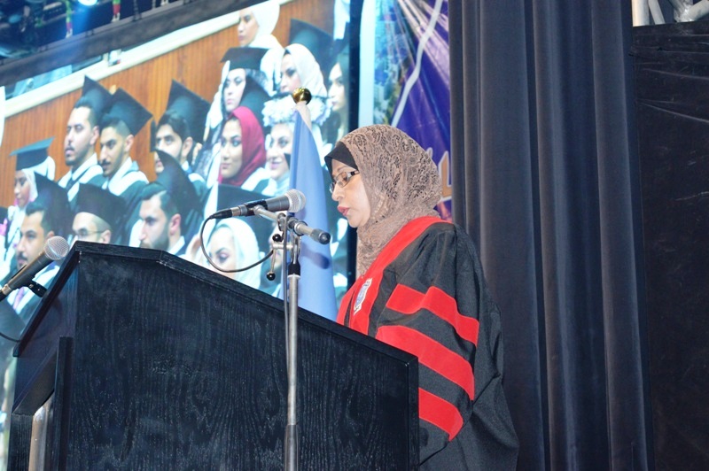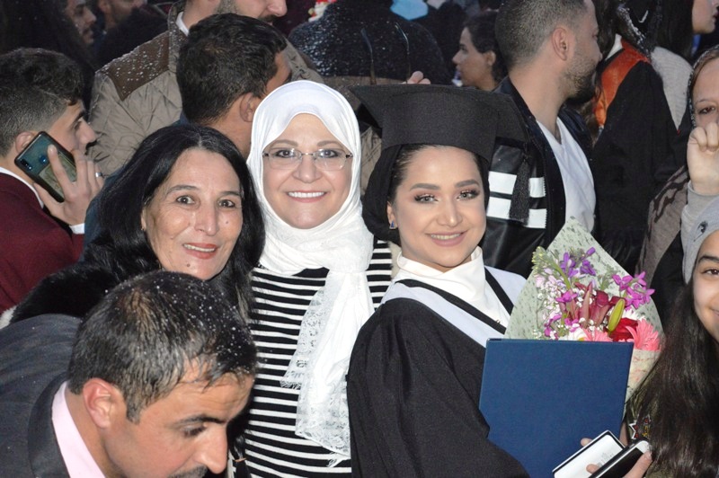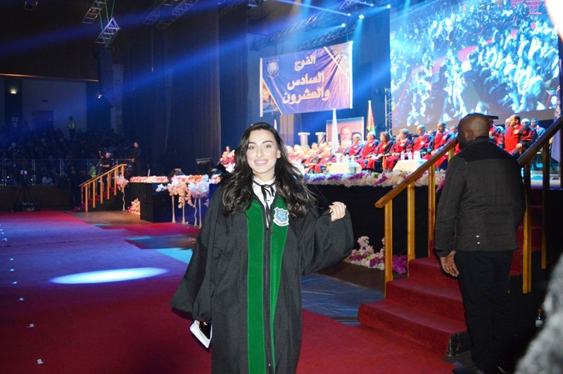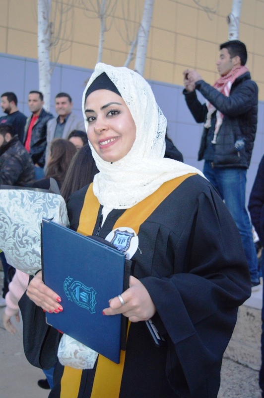 تلا ذلك كلمة الخريجين والخريجات القتها الطالبة دانيا قطيشات من كلية الحقوق شكرت خلالها القائمين على الجامعة ورئاستها والهيئتين التدريسية والادارية وكافة العاملين فيها واشادت بالمناخ التعليمي والاكاديمي والبيئة التعليمية المثالية لتحقيق التميز من خلال ما توفره الجامعة من متطلبات لانجاح الخطة الدراسية وتحقيق النتائج المرجوة ، وقدرت عاليا وبإسم كافة الخريجين التعب والدعم الذي قدمه لهم اولياء امورهم للوصول الى هذا اليوم الذي تتحقق فيه امنيات كل طالب علم بنيل شهادته الجامعية متسلحا بها لدخول الحياة العملية بقوة وثبات وثقة بالنفس.