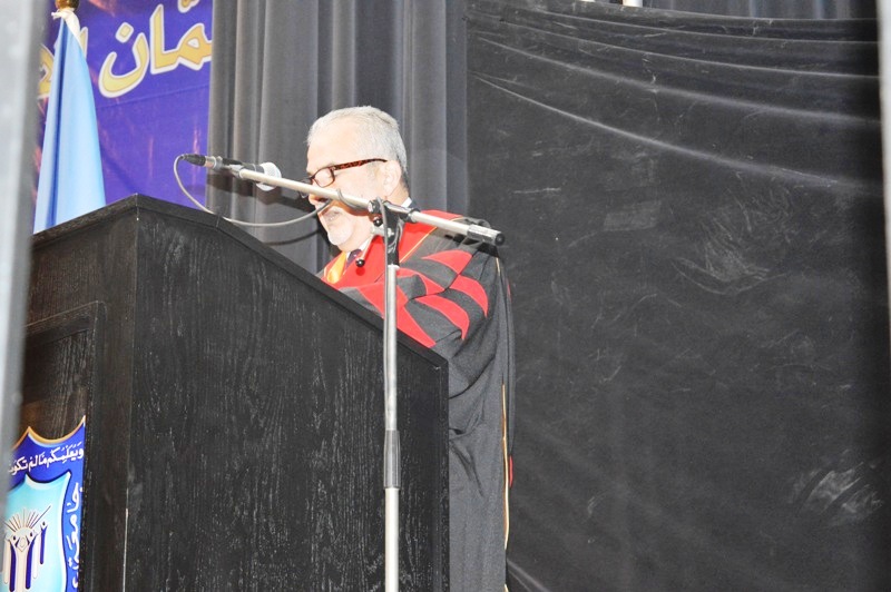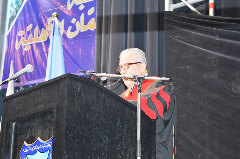 واشار الى الصورة الثالثة من العطاء وهي عطاء الهيئتين التدريسية والادارية التي زودت الطلبة باحدث ما توصل اليه العلم في مجال تخصصات الطلبة الخريجين ، موجها الشكر والتقدير للهيئتين التدريسية والادارية في الجامعة .