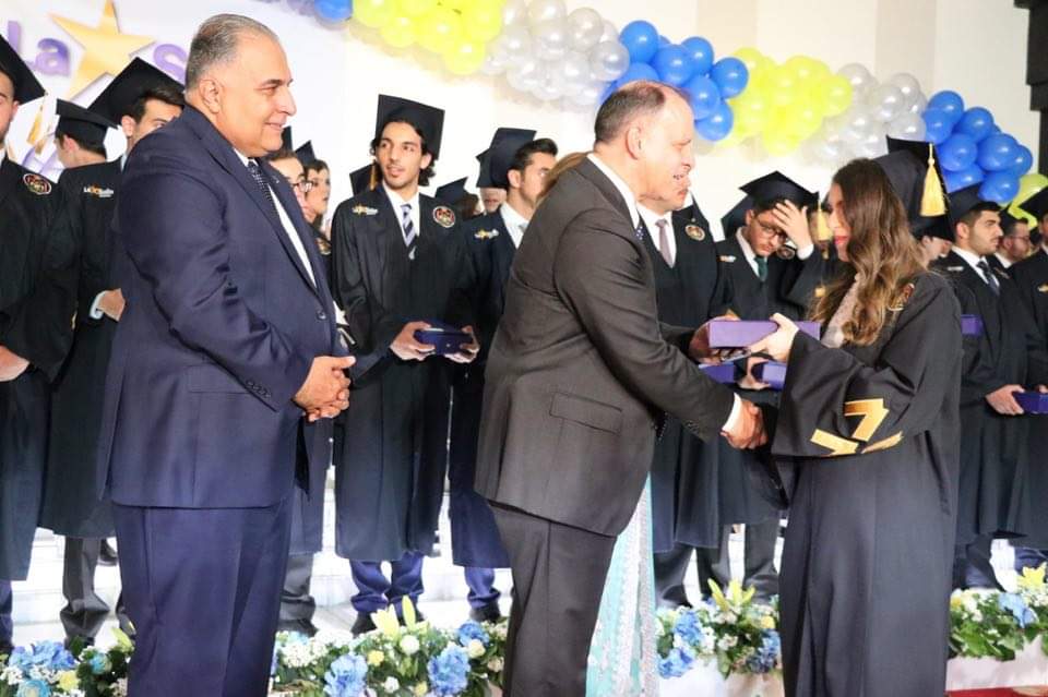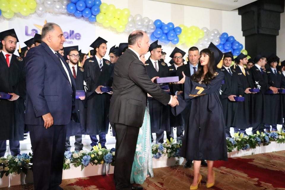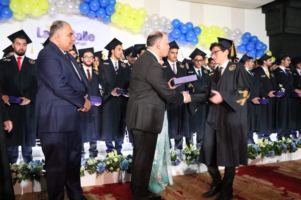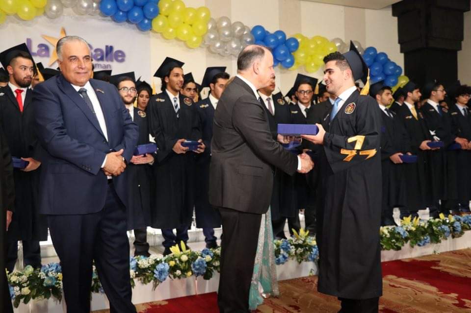 بمناسبة عيد استقلال المملكة الأردنية الهاشمية الثالث والسبعين وبمناسبة عيد القديس يوحنا دي لاسال مؤسس مدارس الفرير بالعالم.وتحت رعاية صاحب السمو الملكي الأمير فيصل بن الحسين، احتفلت الكلية بتخريج الفوج الثاني والستين من طلبتها المتميزين وسط حضور جمع غفير من أهالي الطلبة الخريجين والهيئتين الإدارية في القاعة الملوكية في فندق اللاندمارك .تخلل الحفل كلمات للطلبة الخريجين باللغات العربية فيصل اليماني وناتالي بواب والانجليزية تيا وهاب ومرح القسوس والفرنسية مايا عمارين وماريون الصناع اكدو فيها على الاعتزاز بالوطن ،وكما قدمت فرقة كورال الكليّة مجموعة من الأغنيات الوطنية هيلا يا اردن ونشيد الكلية باشراف حازم الخزوز وفي كلمته أمام الخريجين رحب مدير عام الكلية الأستاذ جابي غزاوي بسمو الأمير فيصل راعي الحفل وكذلك رحب بجميع الحضور ،حيث أكد في كلمته نلتقي اليومَ لنحصدَ وإيّاكم ثَمرةَ التّفوّقِ، الّتي أُحيطتْ بالرّعايةِ اللازمةِ والمتابعةِ الجادّةِ، ويَزيدنا فخرًا أنْ يُشرّفَ سيدي صاحبُ السّمو الملكي الأميرُ فيصلُ بنُ الحسين المعظّم حفلنَا البهيج ، وجودُكَ معنا أضاءَ القلوبَ بالحبِّ والأملِ والرّجاء.. وأضفى علينا البهجةَ والسّرورَ و البهاء.. عرّفْتنا كيفَ يكونُ التّواضعُ وكيفَ يكونُ الوفاء ، فأنتَ مَنْ تُسعدنا دومًا برعايةِ مراسمِ تخريجِ طلبتنا عامًا بعدَ عامٍ وجيلا بعدَ جيل. اليومُ نخرّجُ فوجًا جديدًا من كليّة دي لاسال الفرير ألا وهو الفوجِ الثّاني والسّتين. فَلَكَ منّا سيدي كلُ المحبّةِ والتّقديرِ لحضوركَ بيننا واعدينَ أنْ نسيرَ على نهجِ الهاشميينَ الأشرافِ بقيادةِ مليكِنَا المعظّمِ عبداللهِ الثّاني ابنِ الحسينِ - حفظهُ اللهُ ورعاه- لنلمعَ نجومًا بعونِ الله تعالى في سماءِ الأردنِ الغالي والعالمِ أجمع . واضاف غزاوي بفضل بركاتكم وجُهدكم وإرشاداتكم نتابعُ المسيرةَ في بناءِ أجيالٍ نعتزُّ بها، فهدفُنا في كليّة دي لا سال الفرير أنّ نجعل طلبتنا متسائلينَ، مطّلعينَ، مفكّرينَ، متواصلينَ، ذوي مبادئ، منفتحي العقل، مهتّمينَ،متوازنين، متأمّلينَ، يُسهمونَ في خلقِ عالمٍ أفضلَ وأكثرَ سلمًا في خدمة الله والوطن والإنسان، لهذا تتفرّدِ الكليّة بتعليمها المتميّزِ والمنوّع بالأنظمةِ الوطنية والأجنبيّة حيثُ حازت الكليّة هذا العام على اعتمادِ نظامِ البكالوريا الدّولية، فالشّكر الجزيل لكلِ مَنْ ساهمَ في هذا الإنجازِ .اليوم قد حققتُم نجاحاتٍ باهرةً، سَتُبحرونَ إلى عالمٍ مشرقٍ جميلٍ، فكونوا بذرورًا صالحةً تُنبتونَ أملا، وسفراء الأخلاقِ والعلمِ تُزهرون حبًّا، فحوّلوا كلَّ ذرّةٍ من التّرابِ وسيلةً للعملِ والنَماءِ، واتّخذوا الإبداعَ والتّميّزَ نشيدًا ترنّموا بهِ مدى الحياة، سيروا نحو تحقيق الخيرِ راسخينَ رسوخ الجبل الأشم، فأنتم عمادُ هذهِ الأمّة وبُناةُ مستقبلها ،أنتم الغرسةُ النّاضرة،والنّبتة الصّالحة، والمعولُ الفولاذيّ الذي بهِ نشقُّ طريقَ الحياة، ولا تنسوا أبدًا أنَّ الأردنَّ أوّلا وأنتم الأوائل في الأردنّ، حفظكم الله ورعاكم وجعلكم في الارتفاع فقط كلّ أيام الحياة . دائمًا وأبدًا بلدَ الأمنِ والاستقرارِ والسّلمِ والسّلامِ في ظلِّ صاحبِ الجلالةِ مليكِنا المعظّمِ عبداللهِ الثاني ابنِ الحسينِ حفظَ الله الوطن وحفظ اللهُ المليك .بعد ذلك تفضّل سمو الأمير بتوزيع الشهادات على الطلبة الخريجين، وقدّم مدير الكليّة لسموه هدية تذكارية بهذه المناسبة.