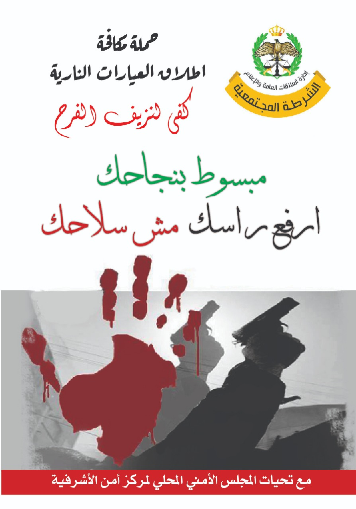 العبارات النارية بالمناسبات قام المجلس المحلي لمركز أمن الاشرفية باطلاق مبادرة (كفى لنزيف الفرح) في قاعة مستشفى الهلال الاحمر والتي جاءت تحت رعاية مدير شرطة شرق عمان العميد غازي المجالي وبمشاركة أعضاء المجالس الامنية المحلية التابعة لمديرية شرطة شرق عمان.