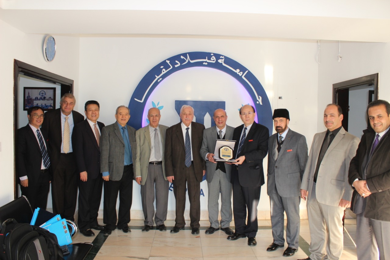 وفي نهاية اللقاء تبادل الطرفين الدروع حيث قام الدكتور رئيس الجامعة بتقديم درع جامعة فيلادلفيا للدكتوروانغ جويونجي تقديراً لجهوده الخيرة في توثيق أواصر التعاون المشترك بين الجامعتين .