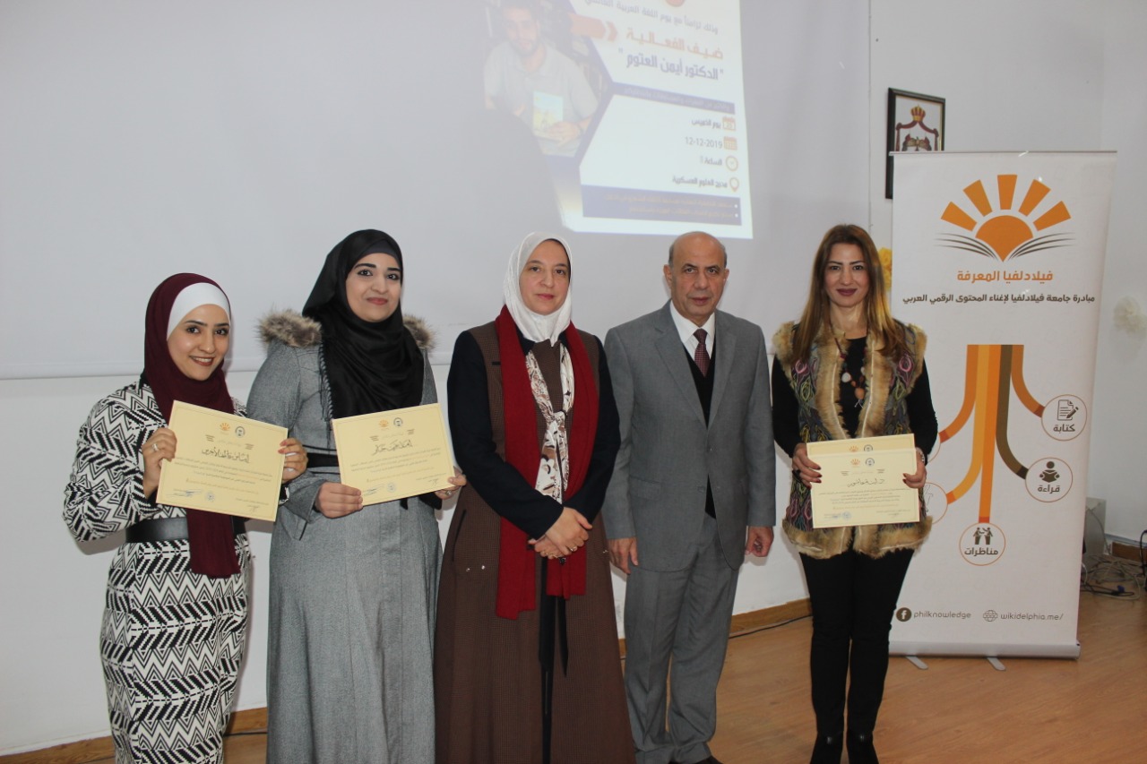 احتفاء بيوم اللغة العربية العالميّ أطلق فريق فيلادلفيا المعرفة وبالتعاون مع مركز اللغات فعالية " نون "، حيث استضافت الجامعة الكاتب الروائي أيمن العتوم الذي تحدّث عن فضل العربية وأهميتها في حياتنا، كما وأنه أعلن عن فوز فريق فيلادلفيا المعرفة بالمستوى الثاني بمسابقة التطوع الأردنية التي نظمتها وزارة الشباب، وتخلل الحفل مسابقات لغوية ماتعة من الطلبة، وتمّ تكريم أصحاب المقالات العلمية من الطلبة برفقة أساتذتهم الذين أغنوا الويكيبديا بمقالاتهم المميّزة في المجالات العلميّة والأدبيّة للدورة البحثية الخامسة من مبادرة فيلادلفيا المعرفة، وكذلك تكريم الفائزين في المسابقات الأدبية في كتابة الخاطرة والقصة القصيرة والشعر العربيّ التي أعلن عنها مطلع كانون الأول، وعقدت التصفيات النهائية للإلقاء الشعري بعد التصفية الأولى والتي نظّمت يوم 9/12/ 2019 وتأهل فيها كل من الطلبة: طاهر صبح، وهيا عميرة، وصالح عوض، ومحمد الثاني، ونور سعيد، وذلك بتحكيم لجنة من جامعة الزيتونة، ومن مركز اللغات في جامعة فيلادلفيا. وقد لاقت الفاعلية ترحيبا وتقديرا من أعضاء الهيئة التدريسية والطلبة .