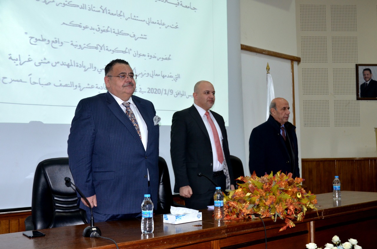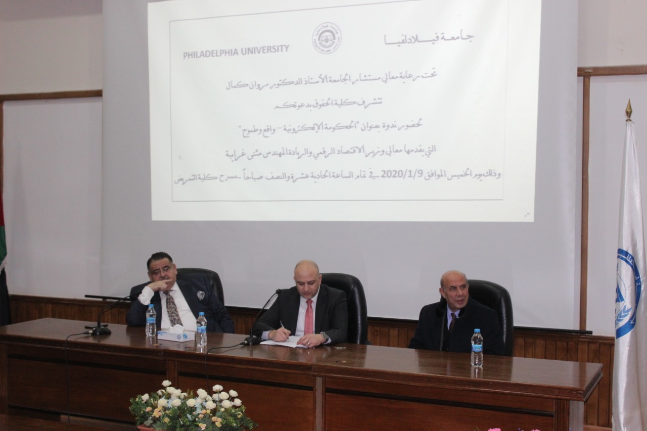 تحت رعاية معالي مستشار جامعة فيلادلفيا الاستاذ الدكتور مروان كمال وبحضور رئيس الجامعة الاستاذ الدكتور معتز الشيخ سالم استضافت كلية الحقوق معالي وزير الاقتصاد الرقمي والريادة المهندس مثنى الغرايبة يوم الخميس 9/1/2020 ضمن فعاليات اليوم العلمي لكلية الحقوق انطلاقاً من رؤية ورسالة جامعة فيلادلفيا ،وتماشياً مع أهداف كلية الحقوق لتنمية فكر الطلبة العلمي وتطويره بما يخدم الوطن .