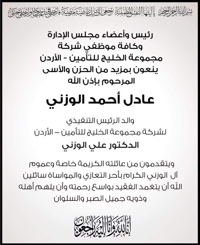 والد الرئيس التنفيذي لمجموعة الخليج للتأمين _ الاردن الدكتور علي الوزني في ذمة الله 2020-04-23 / 07:12pm المركب الاخباري