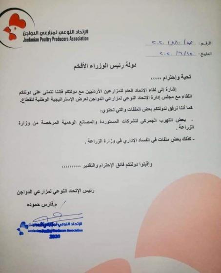 سارعت وزراة الزراعة بالتنصل من المسؤولية حول الدجاج الاوكراني الفاسد الذي اثبت على ارض الواقع عدم صلاحيته والنتيجه تسمم اكثر من الف مواطن، واتلاف كميات كبيرة من الدجاج في البقعة، جاء الرد على لسان المهندس صلاح صبرة المحارمة مدير الاتحاد النوعي لمنتجي الدواجن من خلال المنشور التالي على صفحته في الفيسبوك والذي طلب فيه محاورة وزير الزراعة على الهواء مباشرة امام الجمهور: إلى كل مهتم بهذا الموضوع أود أن أوضح التالي.. اولا تم ارسال هذا الكتاب بناء على طلب دوله رئيس الوزراء الأكرم عقب لقاء دوله الرئيس بتاريخ ١٣/٦/٢٠٢٠ مع الاتحاد العام للمزارعين وحضور ممثل الاتحاد النوعي لمزارعي الدواجن حيث جرى خلال اللقاء الحديث عن التحديات و تم الإشارة إلى عدم التزام وزارة الزراعة بتعليق استيراد لحوم الدواجن من أوكرانيا حسب الإجراءات البروتوكولية فكان طلب دولة الرئيس بتزويده بالوثائق المدعمة لذلك ثانيا تم تسليم الكتاب رسميا لمكتب دوله الرئيس شخصيا ولغايه اللحظه لم يردنا اي رد أو إيضاح على الكتاب ونستغرب كيف تم تسريبه وهو من تاريخ ١٥/٦/٢٠٢٠ ولماذا اثارة هذا الموضوع الان ثالثا.. اننا لا نتهم شخصا بعينه بل نطالب بالتحقيق وتحقيق النزاهة ومحاسبة كل مقصر او مهمل او متخاذل رابعا... نحن نتلمس توجيهات جلاله الملك عبدالله المفدى في حمايه المنتج الوطني و سلامة الغذاء وتطوير قطاعنا الانتاجي.. هذا غايتنا وهدفنا ولسنا سلبيين في تعاطينا مع الأمور خامسا نستهجن نفي وزير الزراعه وتسرعه في النفي فلدينا الوثائق المعززه لذلك و اطلبه للقاء علني للحوار و إيضاح الحقائق صلاح صبرة المحارمه.. مدير الإتحاد النوعي لمزارعي الدواجن
