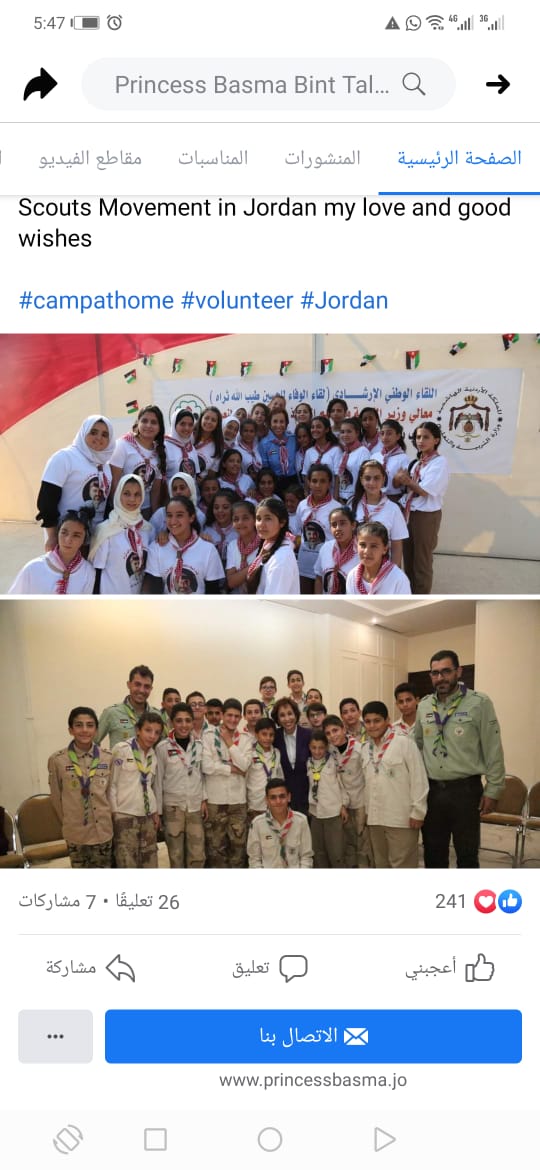 عمان_ وجهت صاحبة السمو الملكي الأميرة بسمة بنت طلال؛ رئيسة جمعية الكشافة والمرشدات الأردنية؛ رسالة محبة وتقدير الى أعضاء أسرة الكشافة والمرشدات في الأردن؛ نظير جهودهم المميزة في مواصلة تنفيذ برامجهم (عن بعد)؛ في ظل الظروف التي فرضها تفشي وباء كورونا.