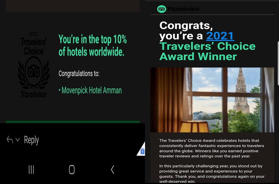 تُقدم جائزة 2021 Travellers Choice للفنادق التي قَدمت تجارب رائعة للمسافرين باستمرار في جميع أنحاء العالم بناء على التقييمات الإيجابية للمسافرين على مدار العام الماضي. وأكد القائمون على هذه الجائزة أنه : بالرغم من ان هذا العام كان مليء بالتحديات ، الا ان فندق موڤنبيك عمان تميز بتقديم خدمات وتجارب رائعة وآمنة لضيوفهم.