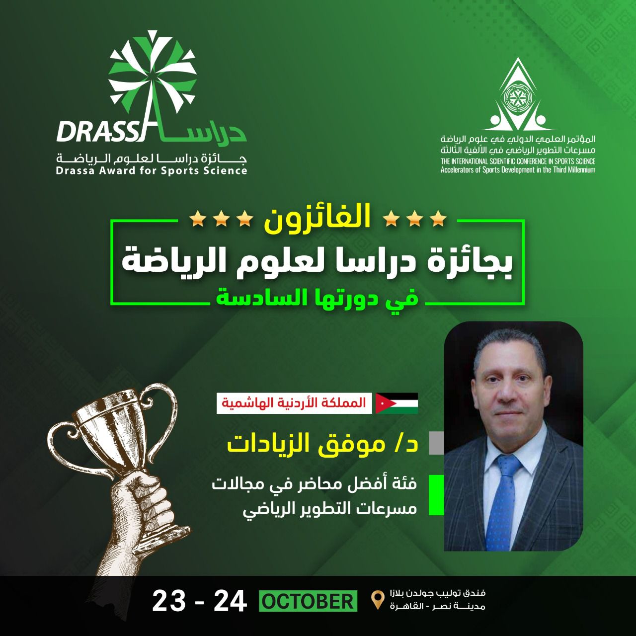 ثانياً: فئة أفضل محاضر رياضي في برامج الاعداد المهني ، فاز بها الدكتور موفق الزيادات من المملكة الأردنية الهاشمية