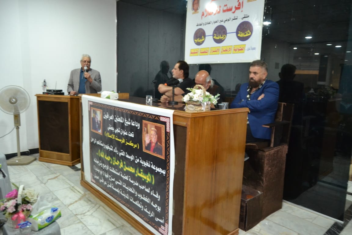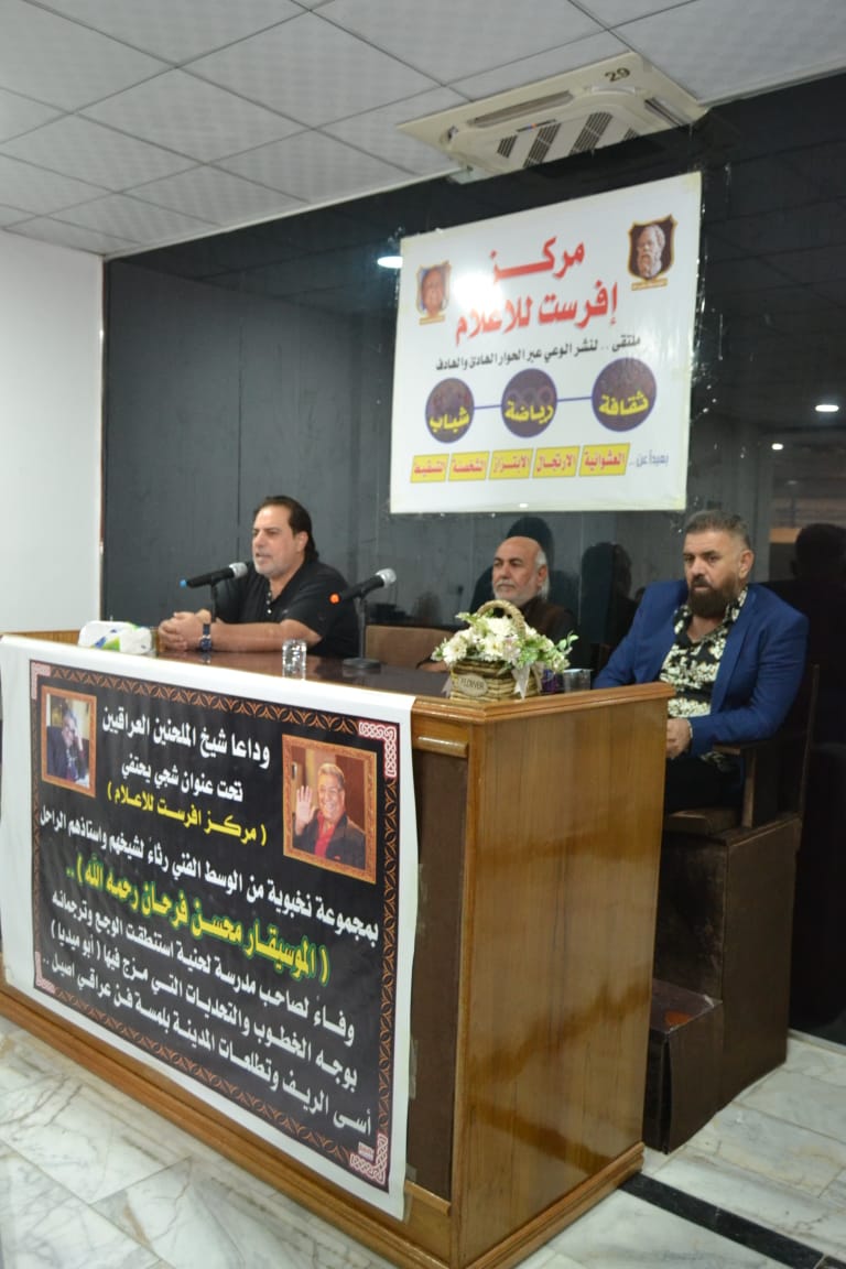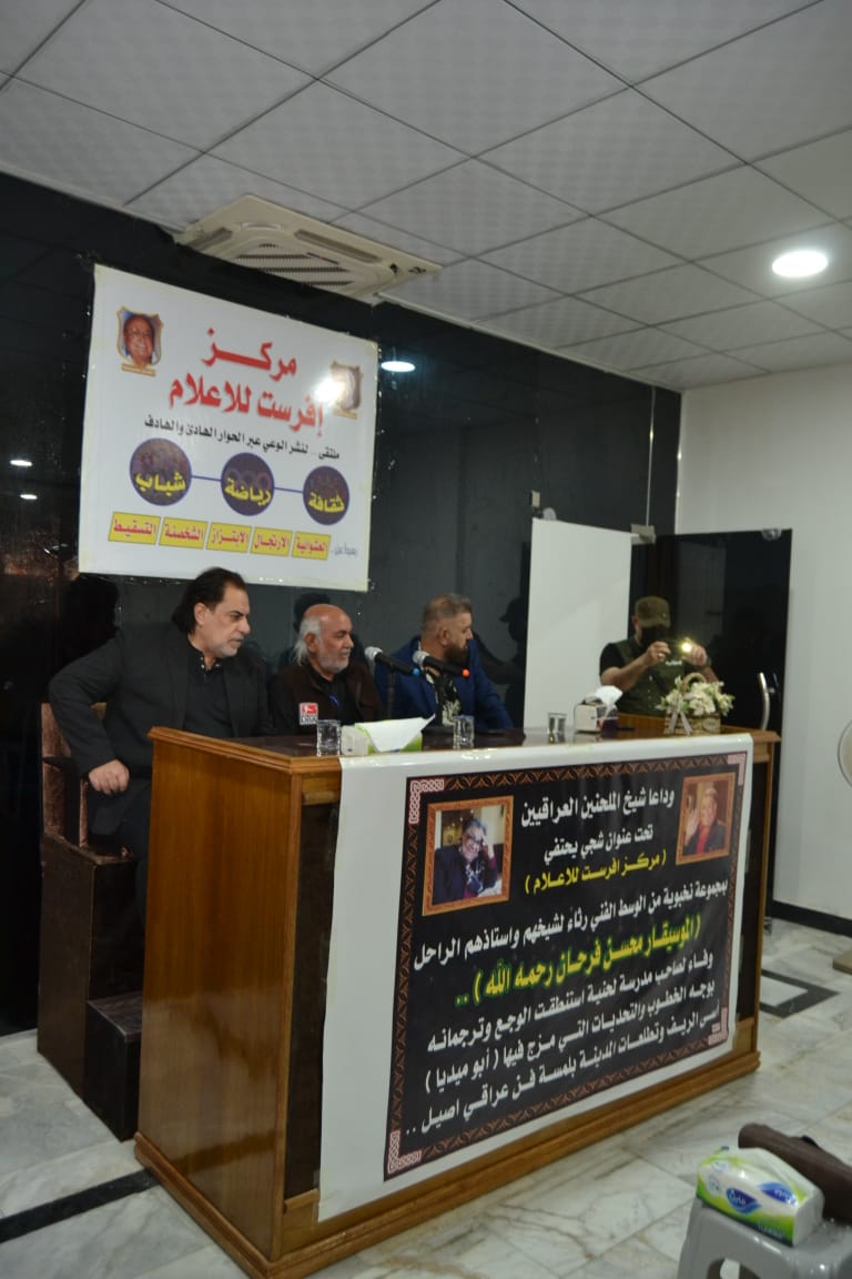 أقام مركز افرست للاعلام حفلا تابينيا بمناسبة رحيل شيخ الملحنين العراقيين الأستاذ محسن فرحان أبو ميديا رحمه الله .. بمنهاج عامر احياه نخبة من الفنانين المقربين وطلاب مدرسته الذين عاشروه وعاصروه ونهلوا من معارفه الموسيقية خلال عقود خلت مع ادباء واكاديميين ورياضيين من محبي الفن العراقي .. وذلك في مقر المركز الكائن قرب جسر الصرافية الذي أكتظ بالضيوف الكرام ممن عبروا عن بالغ حزنهم لرحيل اخر جيل كبار ملحني الانشودة والموسيقى .. وقد أشاد الحضور بدور الراحل وفضله على الالحان العراقي بعد ان استطاع وخلال عقود خلت ان يرسخ فيه ذلك الحزن العميق الشجي الذي عاشه في مدينته كربلاء لينقله الى اعمال اللحن والموسيقى حيث تمكن وانفرد فرحان بان تكون الحانه من الاعمال التي يتغنى بها العراقيين في افراحهم واتراحهم .. وتلك ميزة وظفها بعبقرية مهنية فضلا عن احساس عالي بالوجع العراقي والقضية التي عاشها خلال حقب متعددة ..