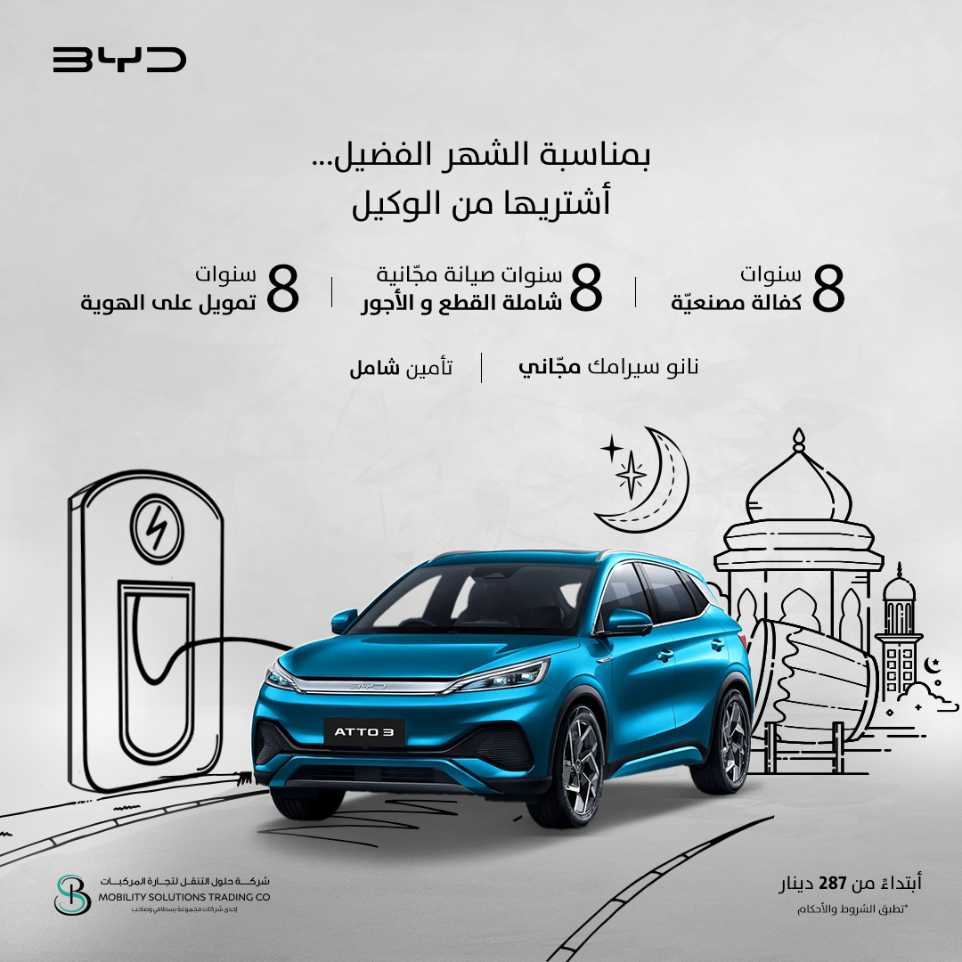 شركة حلول التنقل لتجارة المركبات الوكيل الوحيد لسيارات BYD في الأردن تطلق عروض شهر رمضان المبارك