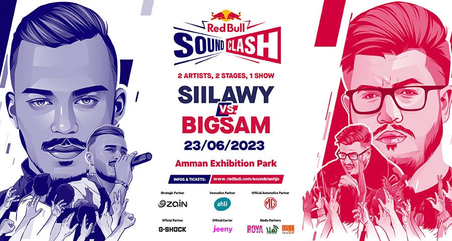 وعند الساعة الثامنة مساء الجمعة 23 يونيو، سنشهد مواجهة فنّية رائعة في أرض المعارض في عمّان، بين بيج سام وسيلاوي، في إطار حفل موسيقي أسطوري على خشبتَي مسرح متقابلتَين. وستكون الكلمة الأخيرة للجمهور الذي سيهتف ويصوّت لفنّانه المفضل في الحدث المرتقب، والذي يتوقّع أن يكون أضخم حفل "ريد بُل ساوند كلاش" في الأردن حتى تاريخه حيث يقام الحدث الفني المميّز هذا العام برعاية زين والبنك الأهلي وإم جي موتور الأردن وجيني وجي-شوك ورؤيا ميوزيك وراديو بلس 104.3 وراديو هلا.