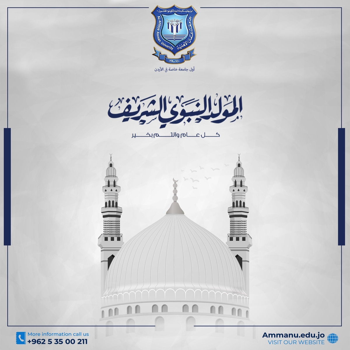 أسرة جامعة عمان الأهلية ممثلة برئيس مجلس الأمناء دولة الأستاذ عبدالكريم الكباريتي وأعضاء المجلس ورئيس هيئة المديرين الدكتور ماهر الحوراني وأعضاء الهيئة ورئيس الجامعة الأستاذ الدكتور ساري حمدان وأعضاء الهيئتين التدريسية والإدارية وطلبة الجامعة، يتقدمون بمناسبة ذكرى المولد النبوي الشريف بالتهنئة والتبريك من قيادتنا الهاشمية وعلى رأسها جلالة الملك عبدالله الثاني ابن الحسين المعظم ومن الشعب الاردني ومن أمتنا العربية والأمة الاسلامية ، داعين الله عز وجل ان يعيد هذه الذكرى العطرة المباركة عليهم جميعا بالخير والبركات .