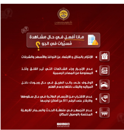 نشر المركز الوطني للأمن وإدارة الأزمات تحذيرات للمواطنين في حال مشاهدة مسيرات في الجو.