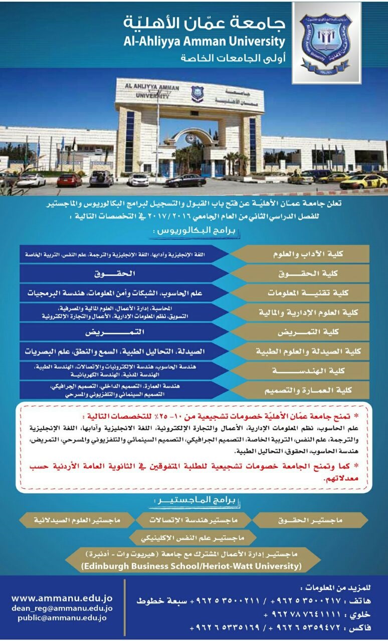اعلنت جامعة عمان الاهلية عن فتح باب القبول والتسجيل لبرامج البكالوريوس والماجستير للفصل الدراسي الثاني من العام الجامعي 2016/2017 في التخصصات المعلن عنها .