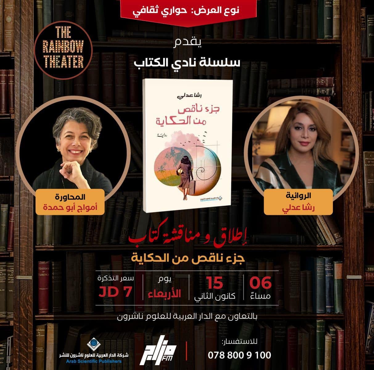 حيث ينظم مسرح الرينبو ( عمان ) ، حفل توقيع ومناقشة كتاب " جزء ناقص من الحكاية " للروائية المصرية (رشا عدلي )، مع المحاورة : امواج ابو حمدة , وذلك فى تمام الساعة السادسة من مساء يوم الاربعاء الخامس عشر من الشهر الجاري , جبل عمان شارع الرينبو .