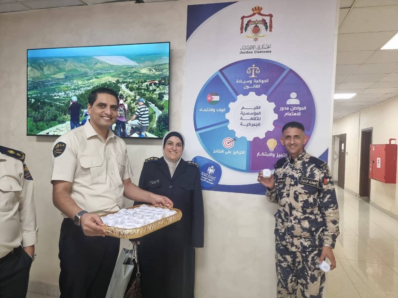 قدّم فريق الثقافة المؤسسية بالجمارك الأردنية مجسم قيم الثقافة المؤسسية لمدير عام الجمارك الأردنية، لواء جمارك أحمد العكاليك تزامناً مع انطلاق فعاليات الفريق بالمراكز الجمركية، ولدوره الريادي كقدوة حسنة في محور القيادة.
