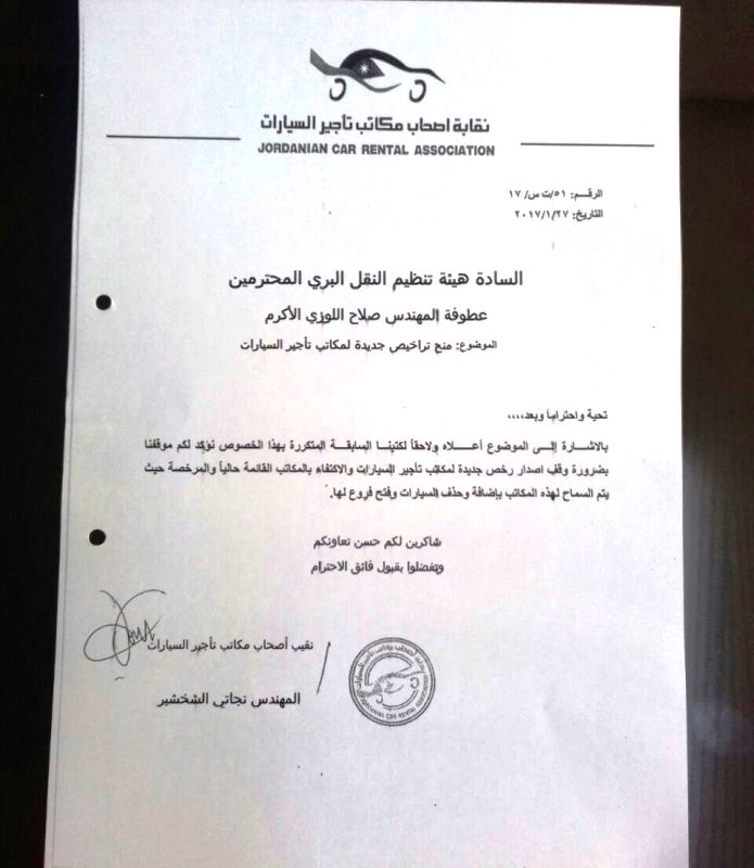 - جددت نقابة اصحاب مكاتب تأجير السيارات السياحية الدعوة لهيئة تنظيم النقل البري بعدم منح تراخيص جديدة لفتح مكاتب تأجير سيارات سياحية ، بالنظر لاكتفاء القطاع بالمكاتب القائمة وعدم الحاجة لفتح مكاتب جديدة.
