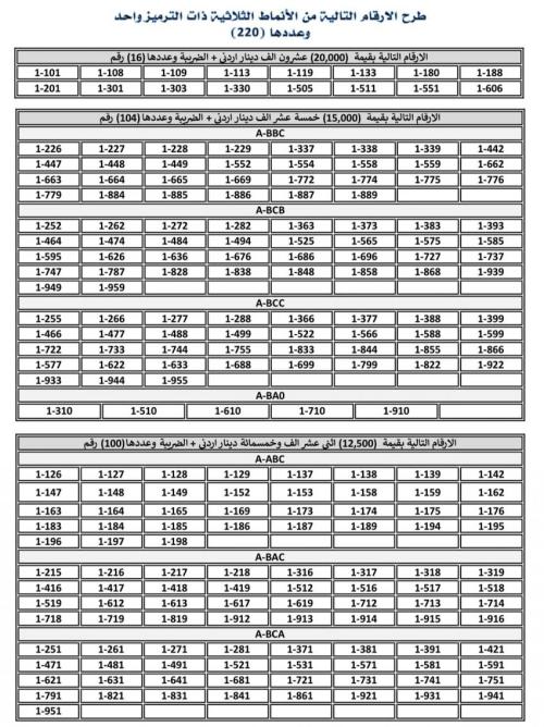 أعلنت إدارة ترخيص السائقين والمركبات عن طرح أرقام ثلاثية مميزة من ترميز /1 للبيع المباشر عبر بوابتها الإلكترونية.