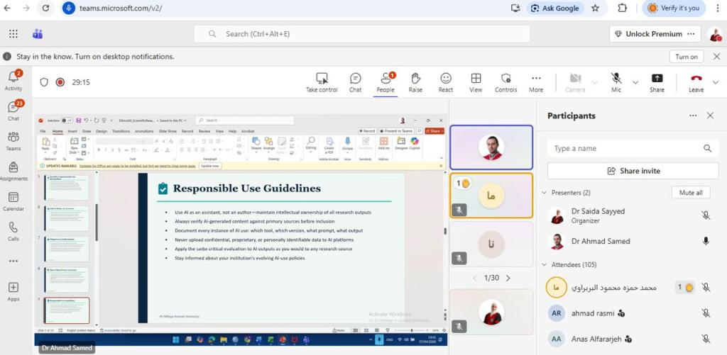 عقدت كلية التمريض الاجتماع الأول للمجلس الاستشاري لمركز جامعة عمان الأهلية للتدريب الصحي للعام الجامعي 2025 / 2026 ، برئاسة أ.د. خلدون حمدان رئيس المجلس وعميد كلية التمريض / مدير المركز، وبحضور أعضاء المجلس الاستشاري : أ. د. أحمد حمدان نائب الرئيس للشؤون الأكاديمية/عميد كلية طب الأسنان، الدكتور إياد شعبان/ مساعد الرئيس لشؤون الاعتماد والجودة والتخطيط- مدير وحدة الموارد البشرية والتطوير المؤسسي، أ. د. غالب عريقات / عميد كلية العلوم الطبية المساندة ، د. أروى الخطيب/ عميد كلية الصيدلة ، د. أيمن غطاشة / المدرب الإقليمي لجمعية القلب الامريكية، السيد لؤي سهاونة / مدير المركز التخصصي للتدريب - المستشفى التخصصي، السيدة عائشة ضمرة/ مدير الشؤون الفنية في المجلس التمريضي الأردني.