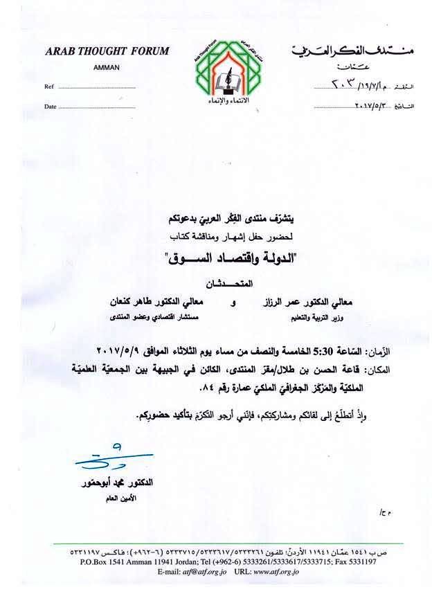 منتدى الفكر العربي يقيم حفل اشهار ومناقشة كتاب الدولة واقتصادالسوق والدعوة عامة 2017-05-09 / 01:41am المركب
