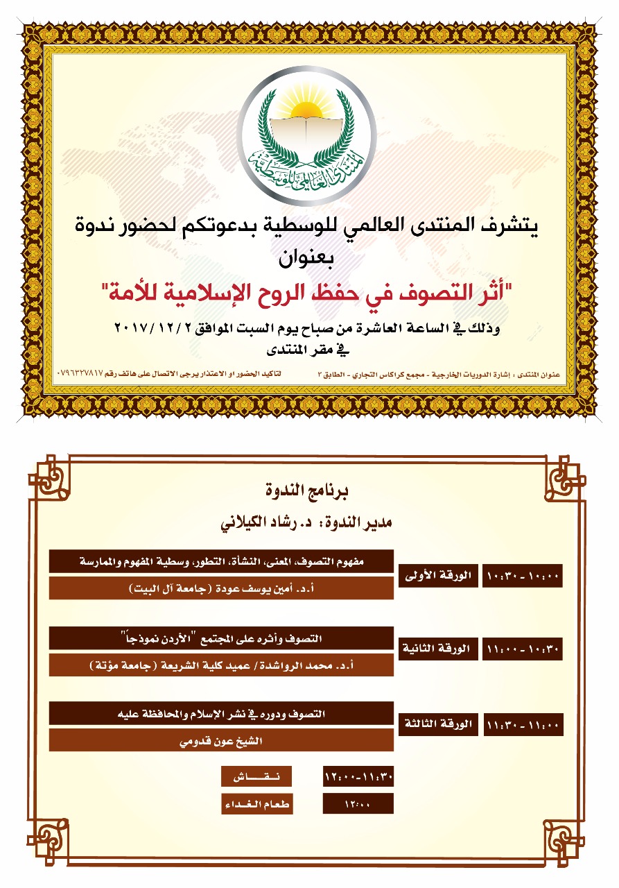 ينظم المنتدى العالمي للوسطية في عمان ندوة حول (: أثر التصوف في حفظ الروح الاسلامية للامة )يوم السبت الموافق 2/12/2017 الساعة العاشرة صباحاً و يشارك في الندوة كل من :