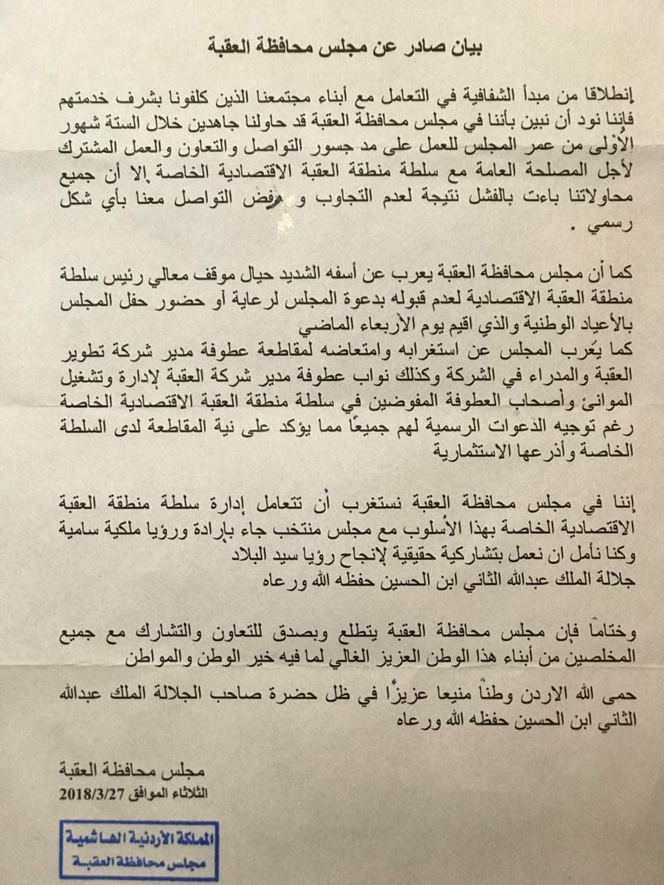 بيان ناري صادر عن مجلس محافظة العقبة ... وثيقة