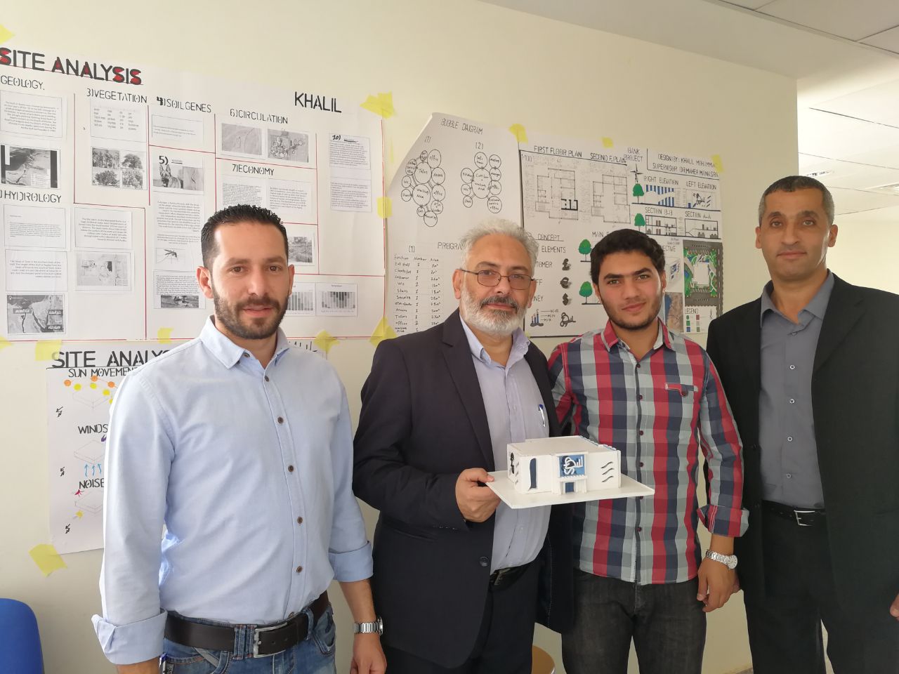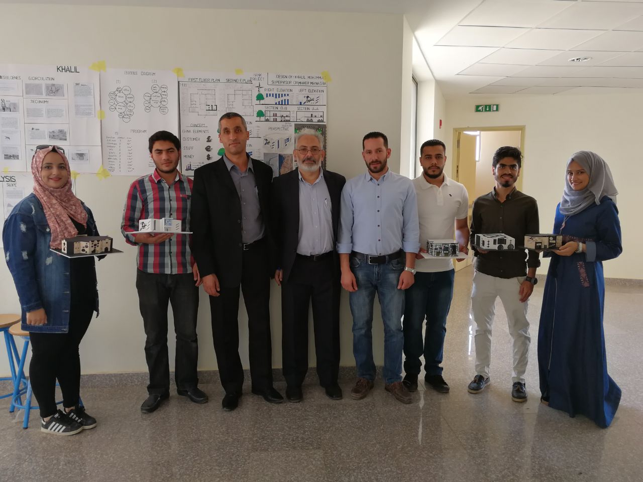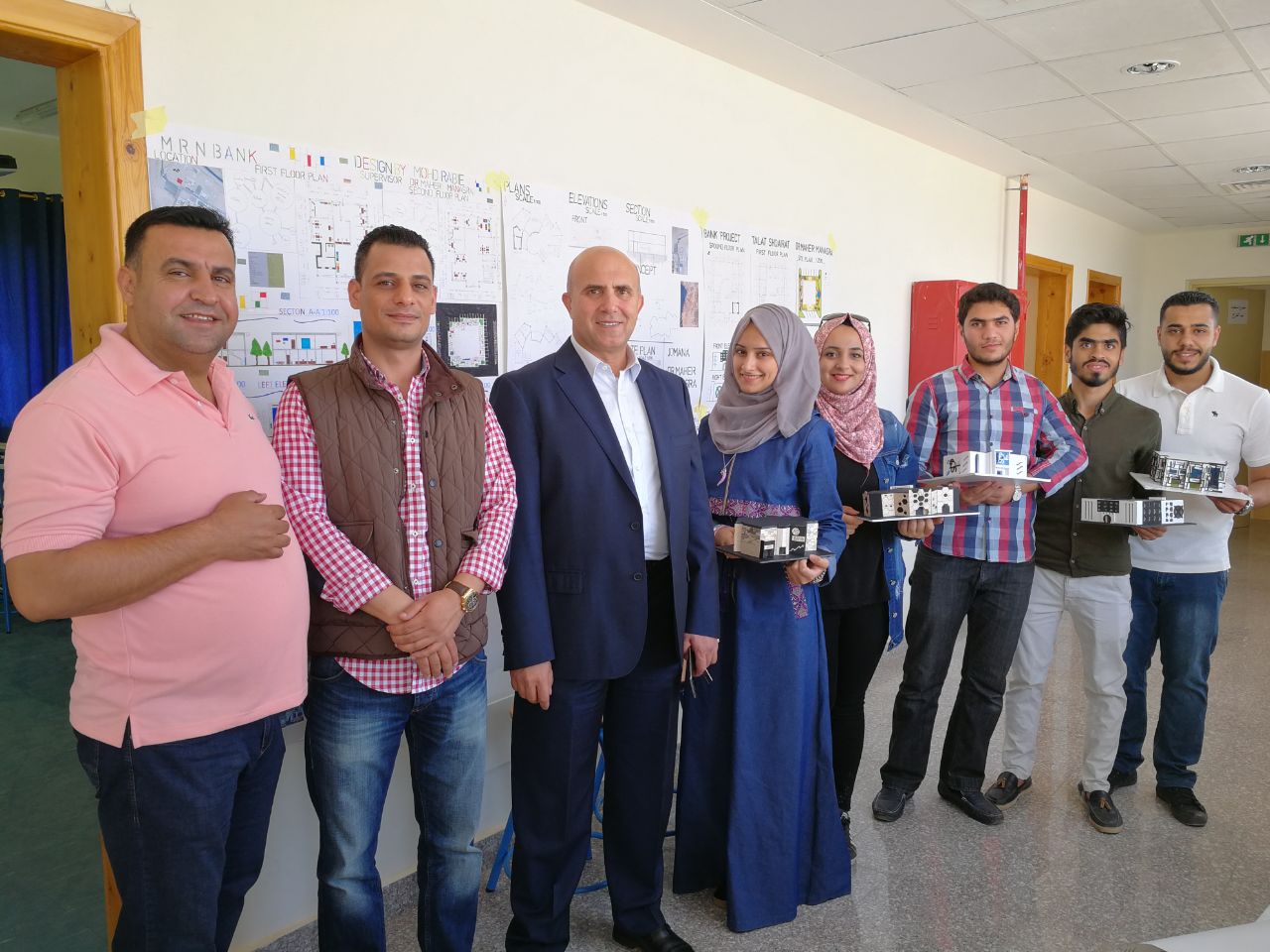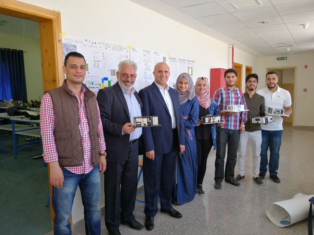 قام عطوفة رئيس الجامعة الأستاذ الدكتور صلحي الشحاتيت الأكرم وذلك ضمن متابعته الدائمة لأبنائه الطلبة بحضور لجنة التحكيم الخاصة بمناقشة طلبة تخصص هندسة العمارة لمشاريعهم التصميمية وذلك ضمن مساق تصميم معماري 2 - "تصميم فرع لبنك". حيث أكد عطوفة الرئيس على ضرورة إعطاء الطلبة لمشاريع واقعية يمكن أن تخدم الجامعة من جهة وكذلك المجتمع المحلي من جهة أخرى بحيث يمكن تنفيذها ضمن الحرم الجامعي وحسب احتياجات الجامعة لتلك المشاريع، ليستفيد من البنك الطلبة وأعضاء الهيئة التدريسية والإدارية والعاملين في الجامعة، هذا ما يسهل عملية التحويلات المالية للطلبة وخصوصا المغتربين ويخفف عنهم عناء التعاملات البنكية والحوالات، هذا ما يعطي مثل تلك المشاريع المقترحة للطلبة الواقعية في تنفيذها. كما وحضر عطوفة الرئيس ولجنة التحكيم والتي حضرها المهندس أحمد الخليلي كعضو لجنة خارجي وكذلك الدكتور موسى شاهين كعضو هيئة تحكيم داخلي. وقام عطوفة الرئيس صلحي الشحاتيت بالاطلاع على تصاميم الطلبة والتي جاءت نتائجها على مستوى من الواقعية في التنوع والوظائف وكذلك في الشكل المعماري النهائي للمبنى والذي يحاكي البيئة المحيطة من جهة وكذلك طبيعة المبنى ووظيفته من جهة أخرى.
