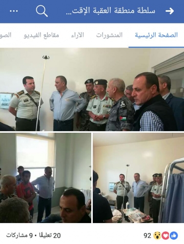 رئيس سلطة مفوضي العقبة ناصر الشريدة قام بعمل زيارات للاطمئنان على المصابين، لكن ما نلاحظه هو أن الصور كانت فقط خاصة به، ولم نر صور للمصابين الذي يؤكد شهود عيان أن وضعهم حرج واصاباتهم خطيرة بعكس ما تصرح به الجهات المسؤولة في العقبة.