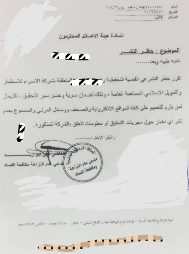 ابو زيد الثلاثاء، حظر النشر بقضية شركة الاسراء للاستثمار والتمويل الاسلامي المساهمة العامة.